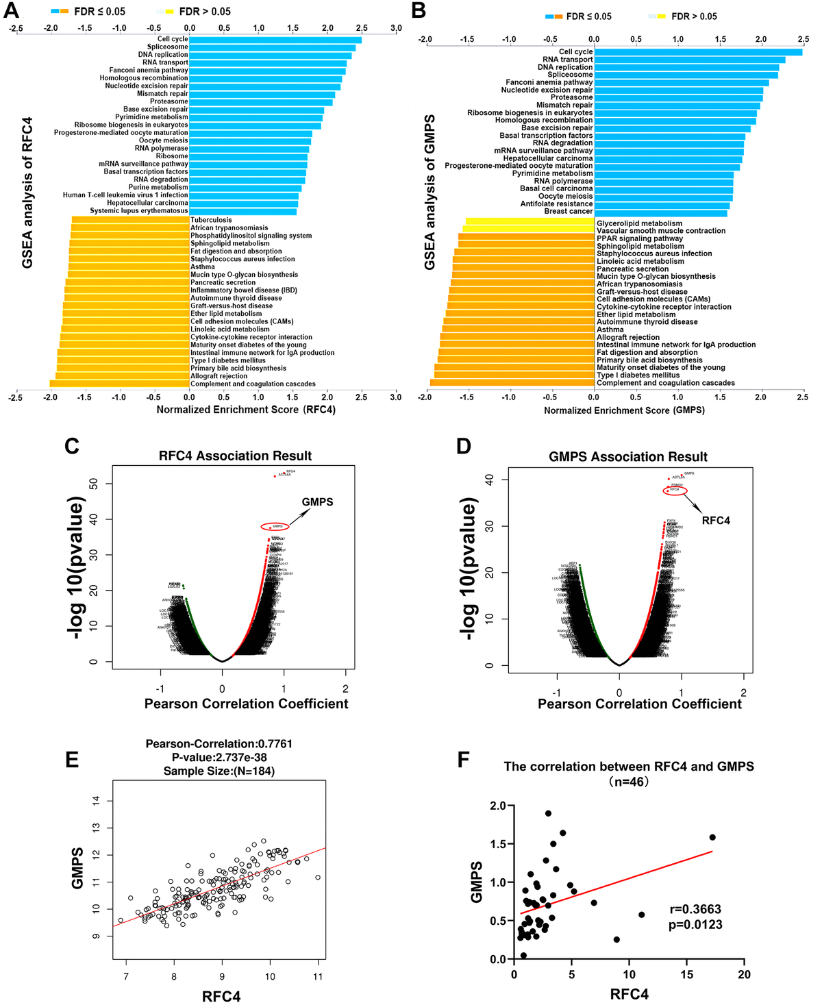 Figure 8. Exploration of the mechanism of RFC4 and GMPS based on GSEA and correlation analysis. (A, B) KEGG pathway analysis of RFC4 and GMPS based on GSEA. (C, D) Correlation coefficient analysis of RFC4 and GMPS in esophageal carcinoma. (E) Correlation between RFC4 and GMPS in TCGA. (F) Correlation between RFC4 and GMPS in 46 tumor samples. *p < 0.05, **p < 0.01, ***p < 0.001.