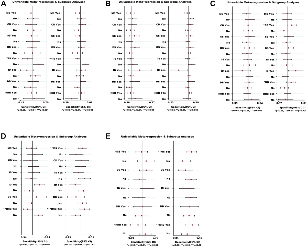 Figure 6. Meta-regression and sensitivity analyses for the efficacy and safety of medications. (A) The VC ratio of non-severe COVID-19 patients. (B) All-cause mortality of non-severe COVID-19 patients. (C) The TEAEs ratio of non-severe COVID-19 patients. (D) All-cause mortality of severe COVID-19 patients. (E) The TEAEs ratio of severe COVID-19 patients. *We conducted meta-regression and sensitivity analyses to estimate the impact of variable for each outcome. The potential modifiers (variables) for meta-regression we select are listed below: MS, DS, DB, CD, SS, IS, ID, and RRB. Abbreviations: COVID-19: coronavirus disease 2019; VC: virological cure; TEAEs: treatment-emergent adverse events; MS: multicenter study; DS: duration of study; DB: double blind; CD: crossover design; SS: sample size; IS: industry sponsorship; ID: inequalities in doses; RRB: risk of reported bias.