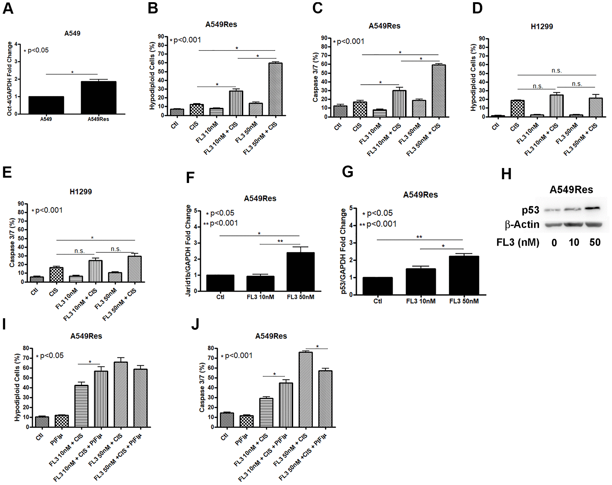Figure 6. FL3 sensitizes A549Res cells but not H1299 cells to cisplatin. Sub-lethal treatment with cisplatin increased Oct-3 expression in A549Res cells (p<0.05) (A). The synthetic flavagline FL3 sensitized A549Res cells to cisplatin as measured by DNA fragmentation (p<0.001) (B) and caspase 3 and 7 activation (p<0.001) (C), Treatment with 50nM of FL3 combined with cisplatin did not increase DNA fragmentation on H1299, but increased caspase 3 and 7 activation, when compared to cisplatin alone (p<0.001) (D, E, respectively). In A549 cells, Jarid1b expression is increased upon FL3 treatment (p<0.05) (F). However, P53 expression is also increased upon FL3 treatment (p<0.001) (G, H). P53 inhibition by pifithrin-μ does not protects A549Res to cisplatin-induced cell death through DNA fragmentation assay but caspase 3 and 7 activation is lowered (p<0.001) (I, J, respectively). Data represent the mean of three independent experiments. FL3 treatment was kept during all experiment for H1299 and A549Res cells.