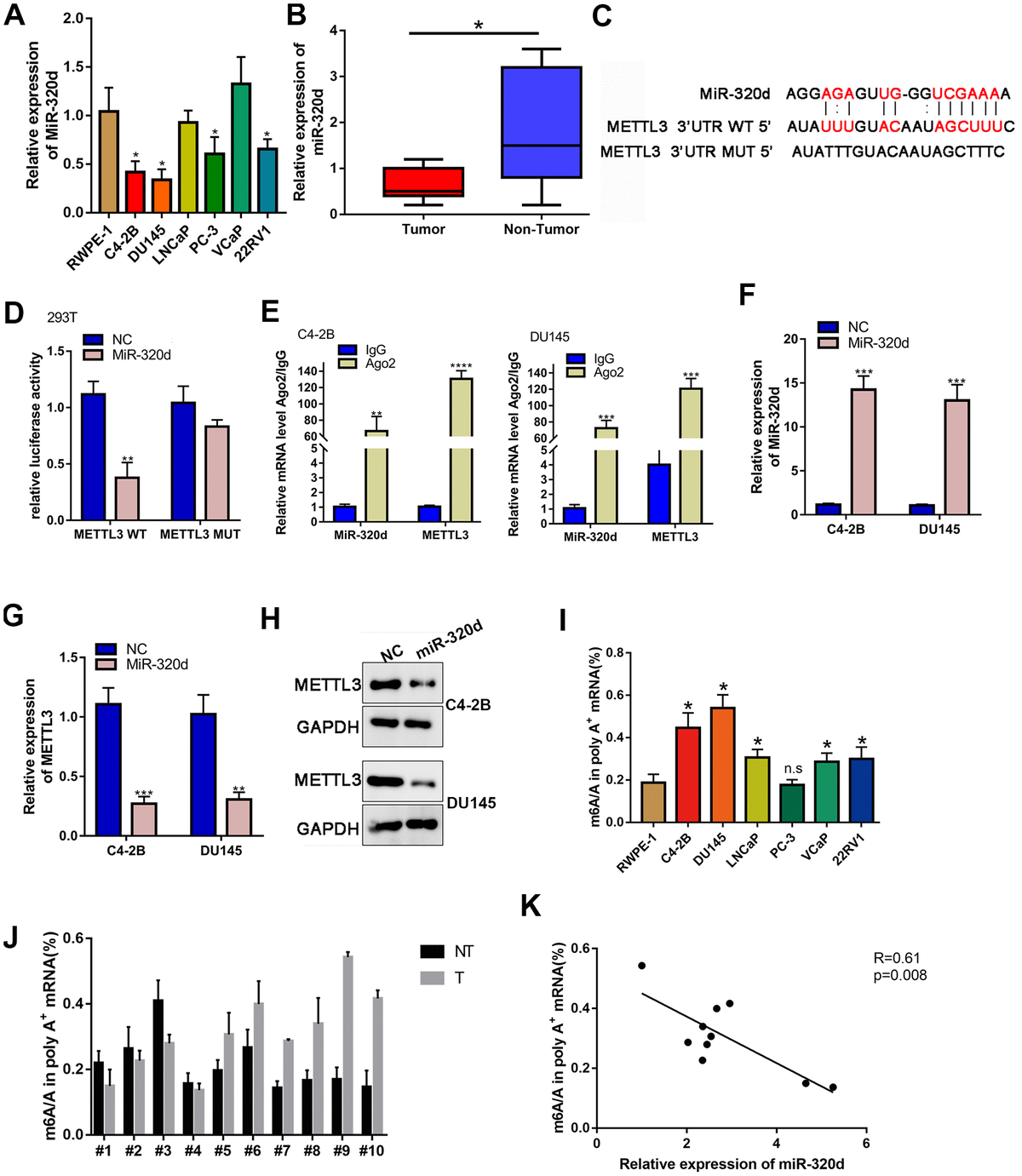 Figure 4. METTL3 is the target gene of miR-320d. (A) RT-qPCR showing miR-320d expression in PCa cell lines. (B) Binding sites between miR-320d and METTL3 from Starbase 3.0 and the mutant sites. (C) Luciferase assay of cells transfected with pmirGLO-3’UTR reporter of METTL3 in the miR-320d overexpressing 293T cells. (D) RIP assays were conducted to show the interaction between miR-320d and METTL3. (E, F) RT-qPCR and western-blot showing expression of miR-320d and METTL3 in the miR-320d overexpressing PCa cells. (G, H) RT-qPCR and western blot were conducted to show KIF3C expression under indicated transfection. Data are reported as means ± standard deviation of three independent experiments. *p < 0.05; **p < 0.01. (I, J) Quantification of m6A levels in mRNA extracted from pancreatic cancer cell lines and PCa tissues. (K) The correlation of the miR-320d expression and m6A level in the PCa tissues. *p < 0.05; **p < 0.01.