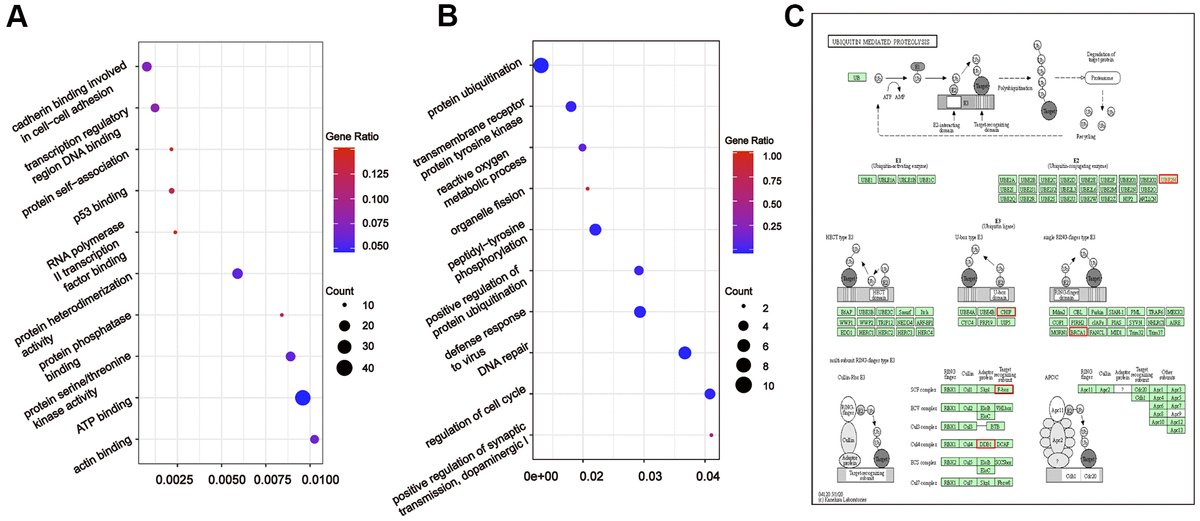 Figure 5. Gene ontology enrichment analyses with the target genes of hub miRNA/tDRs in silva pattern gastric and substantial-LVSI. (A) KEGG pathway analysis for the target genes of hsa-miR-214-3p, Other-13:26-tRNA-Lys-CTT-1-M11 and Other-2:23-tRNA-Val-AAC-1-M7 in Silva pattern Gastric. (B) KEGG pathway analysis for the target genes of other-14:33-tRNA-Lys-CTT-1-M2, other-3:35-tRNA-Lys-CTT-1-M2 and other-14:28-tRNA-Lys-CTT-10 in substantial-LVSI patients. (C) Mapping of ubiquitin mediated proteolysis pathway. Red marked nodes are associated with hub miRNA/tDRs.