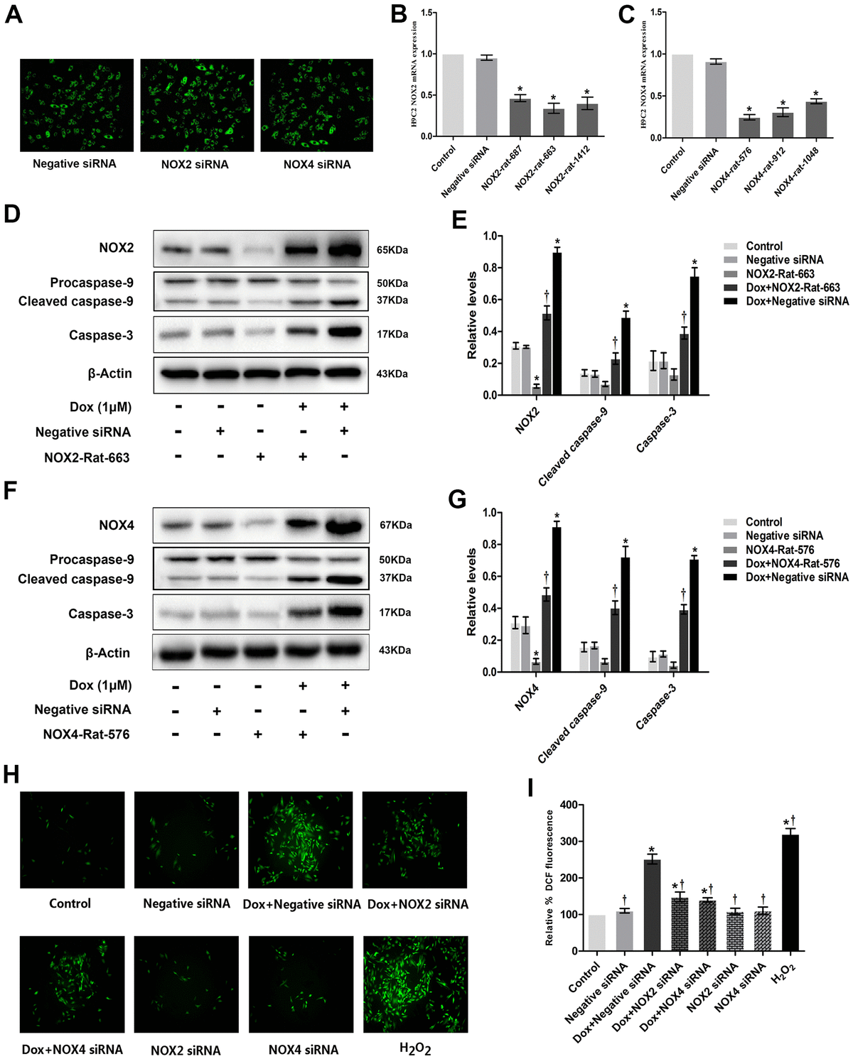 Figure 3. Knockdown of NOX2 and NOX4 expression could reduce DOX-induced ROS production and expression of apoptotic proteins in H9c2 cells. (A) Fluorescence microscope observation of H9c2 cells after transfecting with Negative siRNA, NOX2 siRNA and NOX4 siRNA (×100). (B) Three distinct NOX2 siRNAs and one negative siRNA were designed, and Nox2-rat-663 was selected as the best interference fragment by PCR. (C) Three distinct NOX4 siRNAs and one negative siRNA were designed, and Nox4-rat-576 was selected as the best interference fragment by PCR. (D) Western blot analysis of NOX2 siRNA and DOX-treatment on NOX2, caspase-3, cleaved caspase-9 protein levels. (E) Densitometry analysis of the protein bands of NOX2, caspase-3, cleaved caspase-9 proteins. (F) Western blot analysis of NOX4 siRNA and DOX-treatment on NOX4, caspase-3, cleaved caspase-9 protein levels. (G) Densitometry analysis of the protein bands of NOX4, caspase-3, cleaved caspase-9 proteins. (H) Effect of NOX2 siRNA, NOX4 siRNA and DOX-treatment on ROS levels at 12 h time point in H9c2 cells. (I) Microscopic analysis of NOX2 siRNA, NOX4 siRNA and DOX-treatment on ROS levels by DCF Fluorescence. *P<0.05 vs. Control; †P<0.05 vs. Dox. DOX, doxorubicin; siRNA, small interfering RNA.