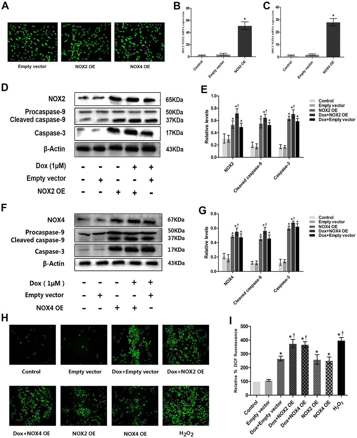 Figure 4. Overexpression of NOX2 and NOX4 could increase DOX-induced ROS production and expression of apoptotic proteins in H9c2 cells. (A) Fluorescence microscope observation of H9c2 cells after transfecting with Empty vector, NOX2 OE and NOX4 OE (×100). (B) The bar graph of NOX2 eukaryotic expression plasmid verified by RT-PCR. (C) The bar graph of NOX4 eukaryotic expression plasmid verified by RT-PCR. (D) Western blot analysis of NOX2 OE and DOX-treatment on NOX2, caspase-3, cleaved caspase-9 protein levels. (E) Densitometry analysis of the protein bands of NOX2, caspase-3, cleaved caspase-9 proteins. (F) Western blot analysis of NOX4 OE and DOX-treatment on NOX4, caspase-3, cleaved caspase-9 protein levels. (G) Densitometry analysis of the protein bands of NOX4, caspase-3, cleaved caspase-9 proteins. (H) Effect of NOX2 OE, NOX4 OE and DOX-treatment on ROS levels at 12 h time point in H9c2 cells. (I) Microscopic analysis of NOX2 OE, NOX4 OE and DOX-treatment on ROS levels by DCF Fluorescence. *P<0.05 vs. Control; †P<0.05 vs. Dox. Dox, doxorubicin; OE, overexpression.