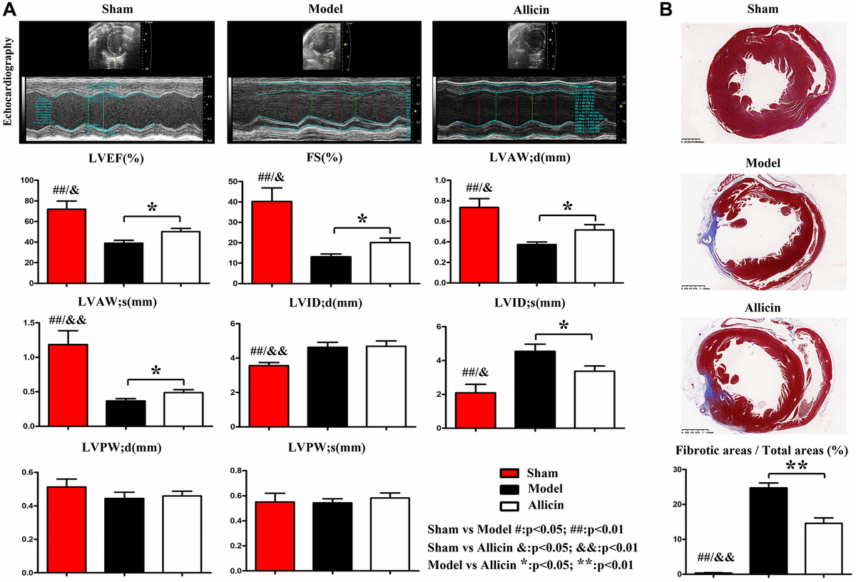 Figure 1. Allicin attenuated myocardial ischemia-induced cardiac fibrosis and improved cardiac function. (A) Representative images of the transabdominal ultrasound imaging were presented. Compared with the Control group, the values of LVEF, LVFS, LVAW;d and LVAW;s were significantly decreased in Model group, while LVIDd and LVIDs were increased (*P < 0.01). Compared with the Model group, the LVEF, LVFS, LVAW;d and LVAW;s were increased in the Allicin group, whereas LVID;s was decreased (*P < 0.05). (B) Masson staining demonstrated that the areas of cardiac fibrosis of the Model group mice were significantly increased compared with the Control group mice's hearts. And the areas of cardiac fibrosis of the Model group mice were significantly increased compared with Allicin group mice (*P < 0.05).
