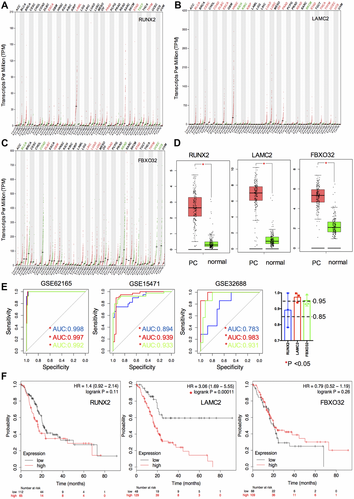 Figure 4. Expression, ROC and survival analysis of key genes. (A–C) Differential expression of key genes (RUNX2, LAMC2 and FXBO32) in various tumor and non-tumor tissues. (D) Differential expression of key genes in PC patients and normal controls. (E) ROC curve of key genes in GSE62165, GSE15471 and GSE32688. (F) Survival analysis of key genes in TCGA PAAD cohort.