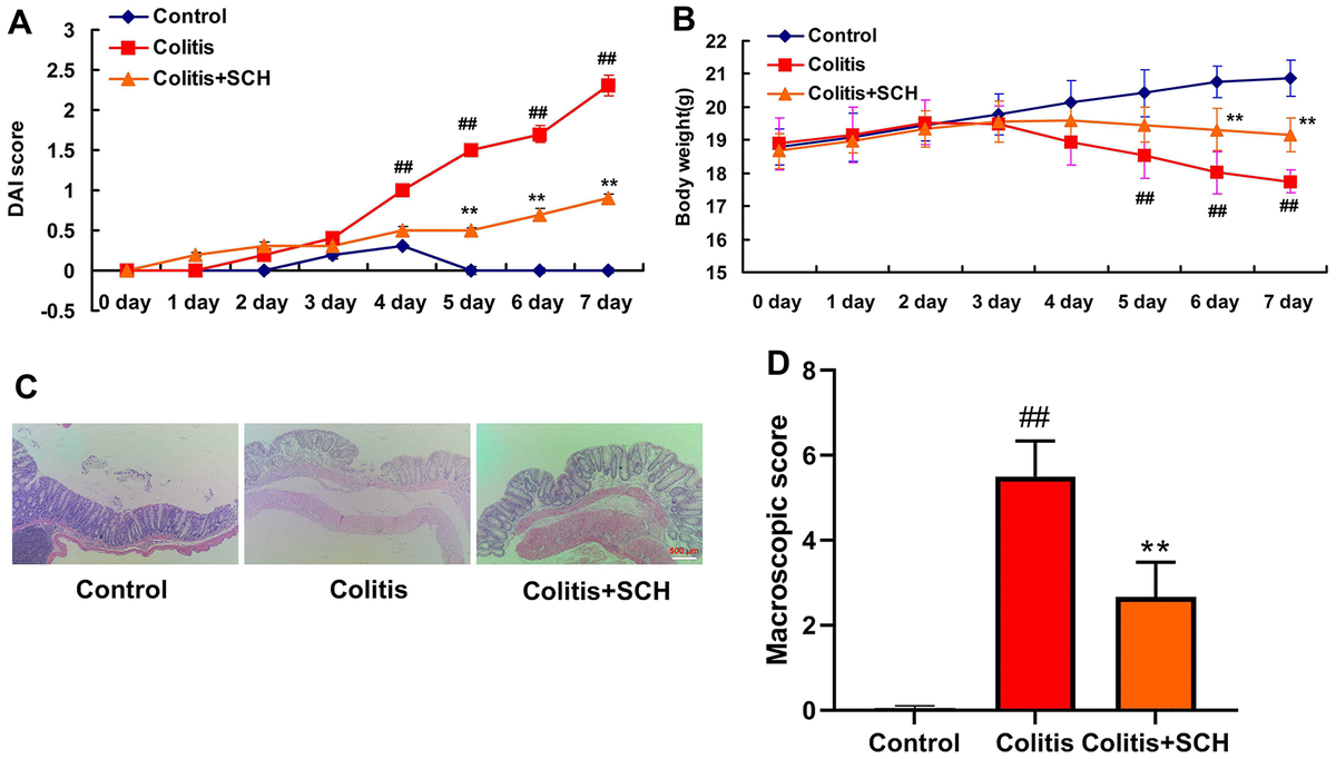 Figure 1. Schisandrin B presented colitis in mice model. (A) DAI score; (B) weight of mice; (C) HE staining results of colon (×200); (D) Colon macroscopic score. ##P<0.01 vs control group; **P<0.01 vs DSS- induced colitis group. Control: blank control group; Colitis: DSS- induced colitis group; Colitis+SCH: Schisandrin was used to treat DSS- induced colitis. SCH, Schisandrin B. Data were expressed as mean ± SEM.