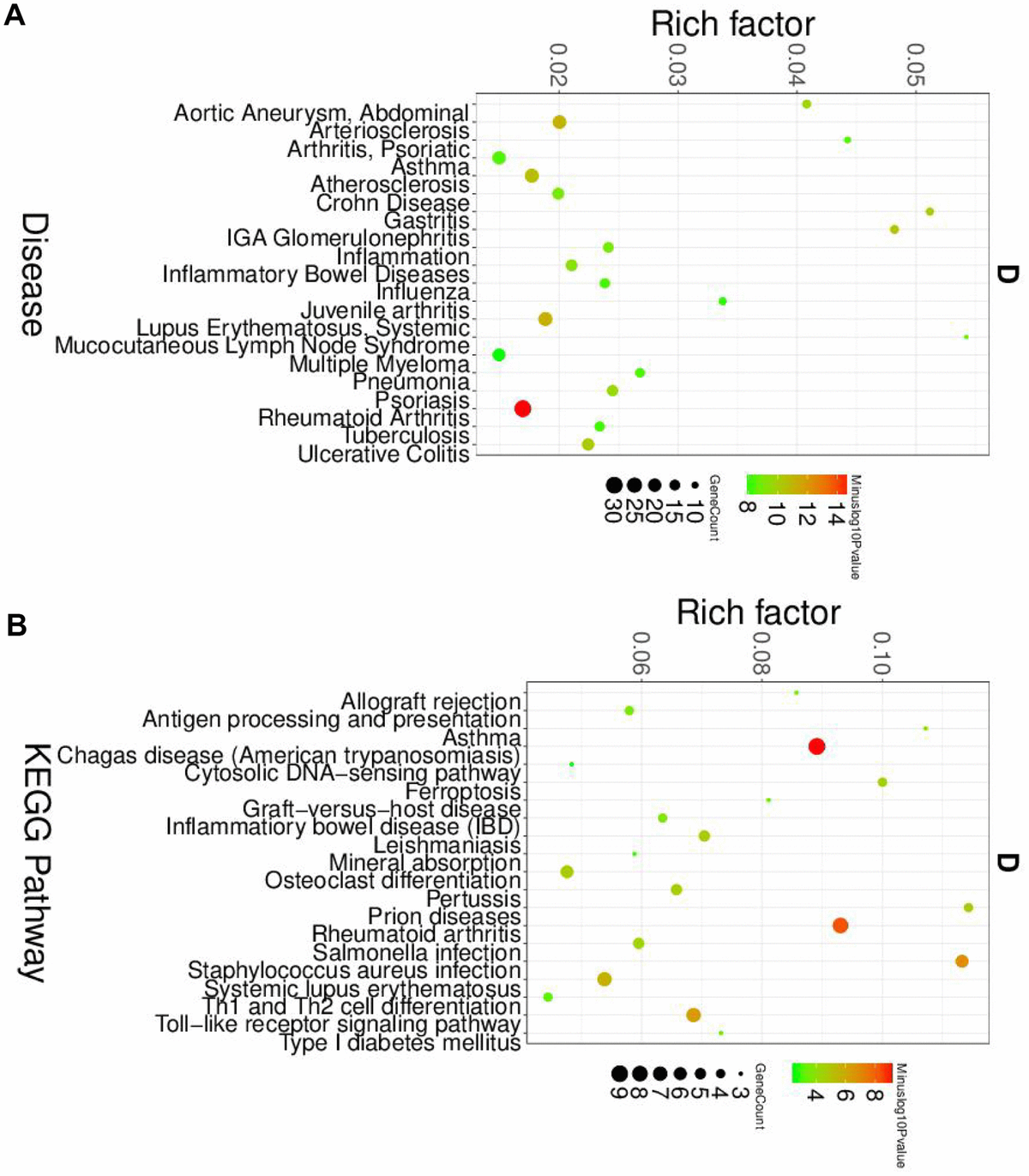 Figure 4.The disease and KEGG enriched of DEGs in macrophage cells. (A) The top disease enriched of DEGs in macrophage cells. (B) The KEGG pathway analyses of DEGs in macrophage cells.