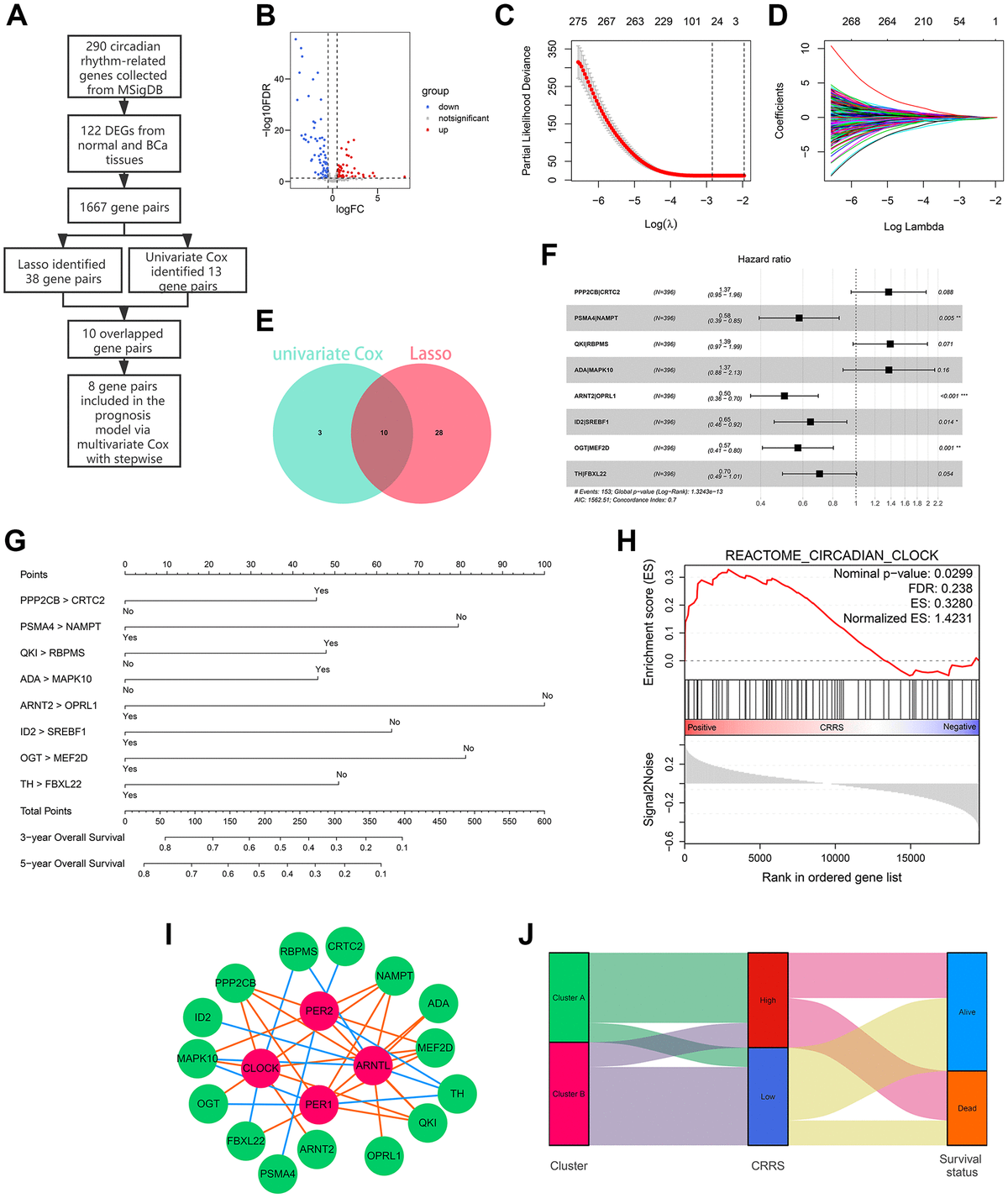 Figure 2. Development of a circadian rhythm-related signature. (A) The process of the prognostic model construction. (B) The volcano plot displaying 122 of 290 circadian rhythm-related genes were differentially expressed between adjacent normal and BCa tissues. (C, D) Lasso regression identified 38 gene pairs correlated with BCa prognosis. The lines with different colors represented different variables. (E) 10 gene pairs were con-determined via univariate Cox regression and Lasso algorithm. (F, G) The forest plot (F) and the nomogram (G) of the established model. (H) The circadian clock pathway was significantly up-regulated in patients with high CRRS. (I) The correlation between the genes in CRRS and known circadian transcription factors. The green bubbles and red bubbles represented the CRRS genes and transcription factors, respectively. The red lines and blue lines represented the positive and negative correlations, respectively. (J) The Sankey plot indicated the association between circadian clustering, CRRS stratification, and survival status. BCa, bladder cancer; CRRS, circadian rhythm-related score.