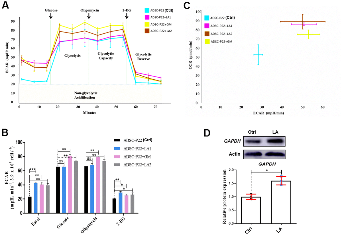 Figure 4. Measurements of glycolysis activities in hADSCs. (A) ECAR in hADSCs at each phase of the glycolysis pathway. (B) Statistical analysis of ECAR at each phase. (C) Relationship between ECAR and OCR in the glycolysis pathway of hADSCs. GM: Metformin. (D) Western blotting of GAPDH protein expression. Data are presented as the mean ± SD of three independent experiments. Statistical significance was determined by the unpaired t-test. *p < 0.05, **p < 0.01, ***p < 0.001 compared with the Ctrl.