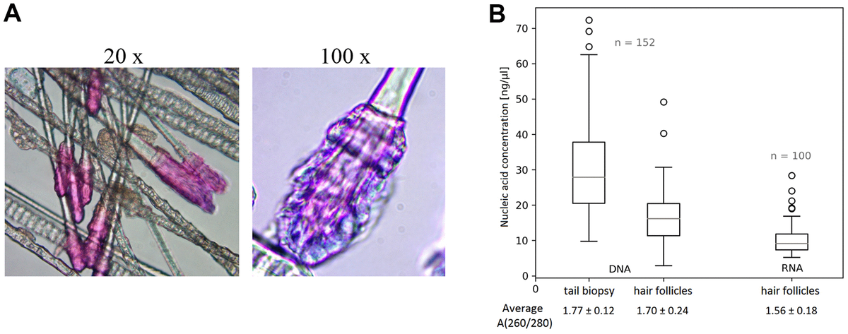 Figure 2. Murine hair follicles as starting material. (A) Representative images of hairs highlighted with Giemsa – Romanowsky staining (and indicated magnification) showing intact hair follicles obtained by sampling with our vacuum collector. (B) Comparison of DNA isolation results from hair follicles obtained with our device and common tail biopsies, and yields of RNA isolated from hair follicles. The quantity and quality of all nucleic acid samples, in 30 μl solutions, were measured using a ND 1000 Spectrophotometer. Data are presented as boxplots showing median, maximum and minimum values, their quartile distribution, interquartile range, and outlier values.