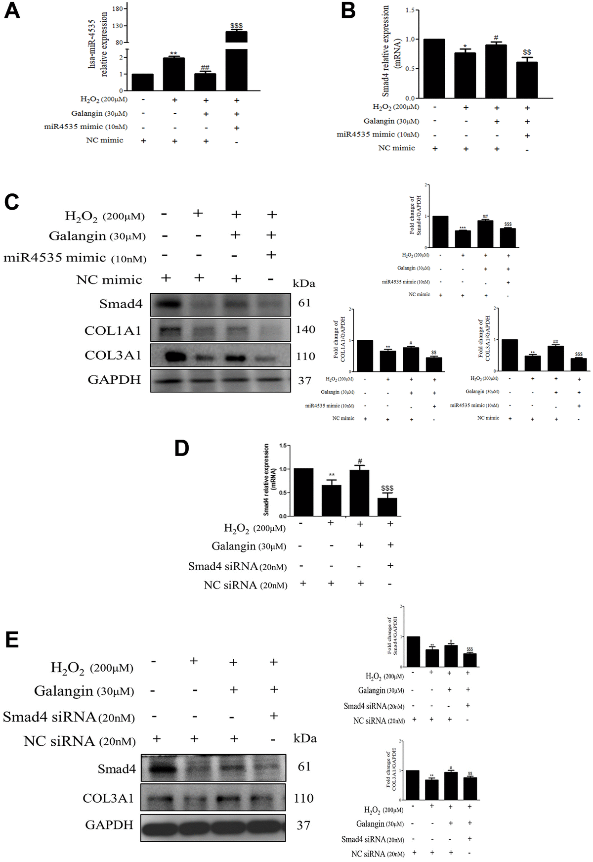 Figure 8. Inhibition of Smad4 by siRNA or hsa-miR-4535 mimic reverses the galangin-mediated enhancement of collagen synthesis in dermal fibroblasts. (A–C) HS68 cells were transfected with hsa-miR-4535 mimic (10 nM) or mimic NC (10 nM) for 1 h followed by cotreatment with galangin (30 μM) and H2O2 (200 μM) for 23 h. Hsa-miR-4535 (A) and Smad4 (B) levels were detected by qPCR to ensure successful transfection. (D–E) HS68 cells were transfected with siRNA Smad4 (20 nM) or siRNA NC (20 nM) for 1 h followed by cotreatment with galangin (30 μM) and H2O2 (200 μM) for 23 h. Smad4 levels were detected by qPCR to ensure successful transfection (D). Protein levels of Smad4, COL1A1 and COL3A1 were analyzed by western blotting (C, E). GAPDH was used as a loading control. Values shown are means ± SE. Quantification of the results is shown (n = 3) *P < 0.05, **P < 0.01, ***P < 0.001 vs. untreated control cells; #P < 0.05, ##P < 0.01, vs. H2O2-treated cells; $$P < 0.01, $$$P < 0.001 vs. H2O2 plus galangin-treated cells.