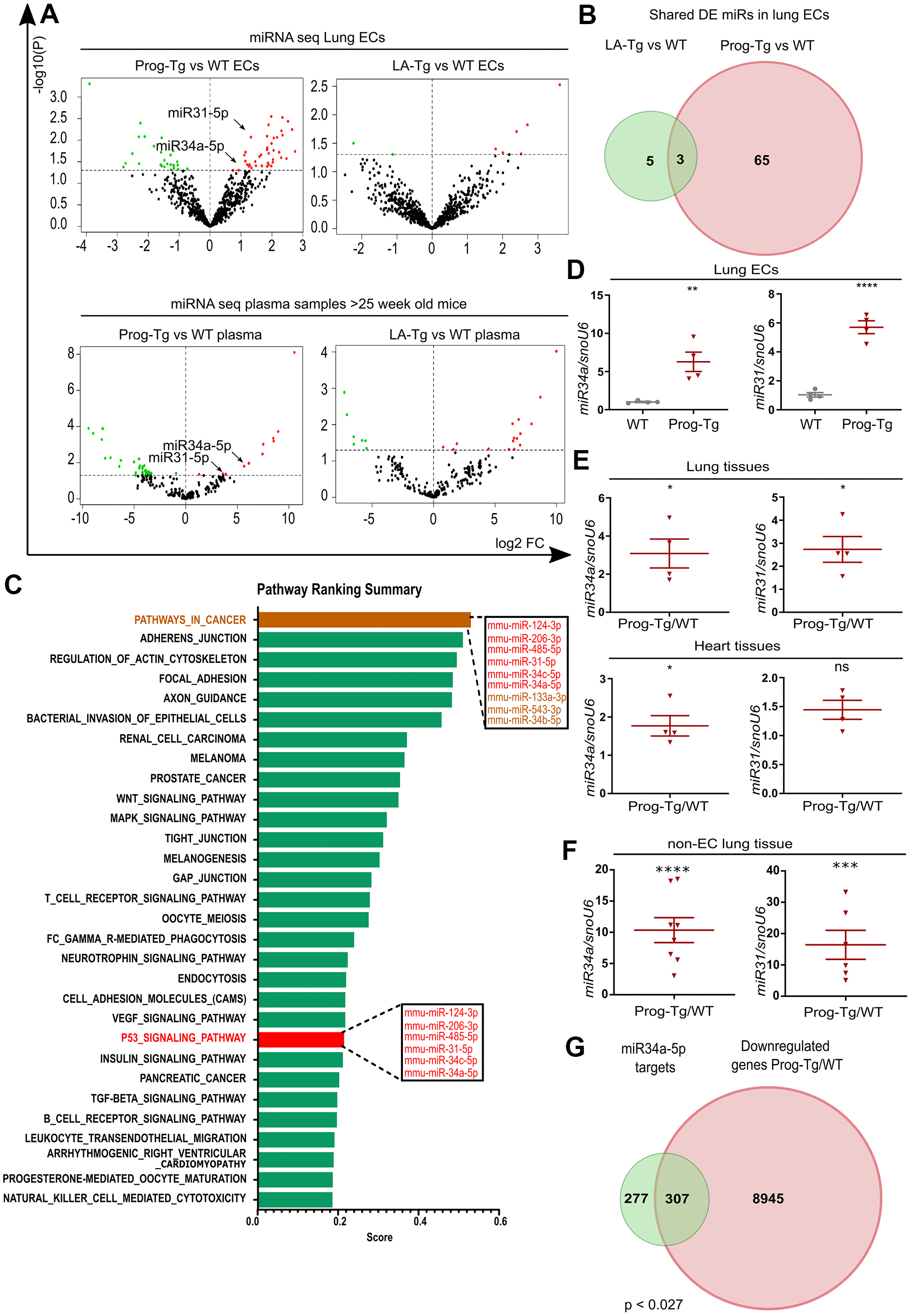 Figure 5. Senescent progerin-expressing ECs display a specific senescence-associated miR signature. (A) Volcano plots exhibiting differential expression (DE) analysis of miRs in Prog-Tg/WT and LA-Tg/WT lung ECs (upper panels) and in plasma samples of >25-week-old mice (lower panels) using threshold as depicted in