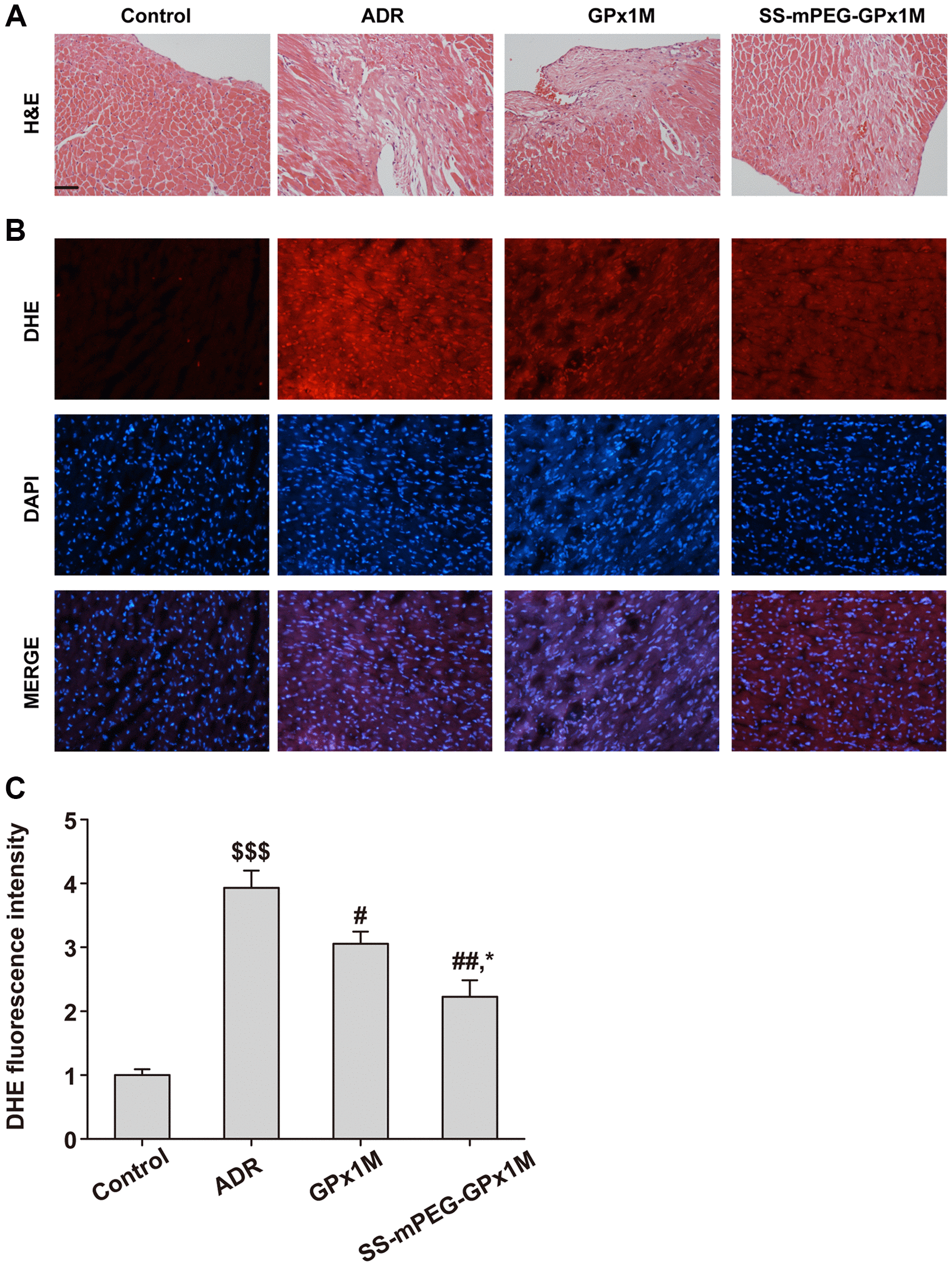 Figure 11. Histopathological changes and ROS measurement in all groups. (A) Analysis of histological evaluation in rat heart tissue using H&E. (B) Determination the accumulation of ROS in rat heart by DHE staining. (C) DHE fluorescence intensity of each group. Scale bars, 100 μm. All data were exhibited as mean ± SD. $$$p < 0.001 vs. the control group, #p < 0.05 and ##p < 0.01 vs. the ADR group, and *p < 0.05 vs. the GPx1M group.