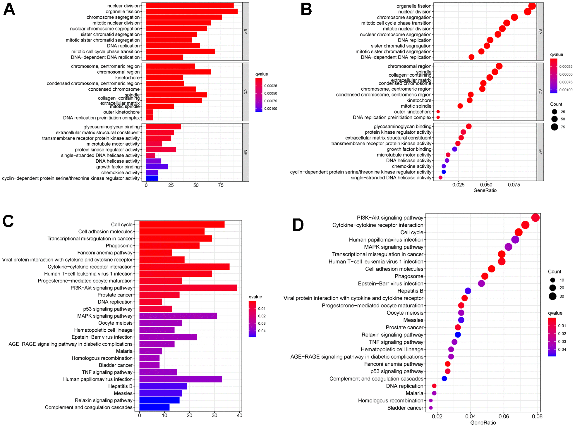 Figure 3. (A, B) GO analysis for TCGA-BRCA DEGs. (C, D) KEGG analysis for TCGA-BRCA DEGs. Abbreviations: GO: Gene Ontology; KEGG: Kyoto Encyclopedia of Genes and Genomes; DEGs: differentially expressed genes; TCGA-BRCA: The Cancer Genome Atlas Breast Invasive Carcinoma.