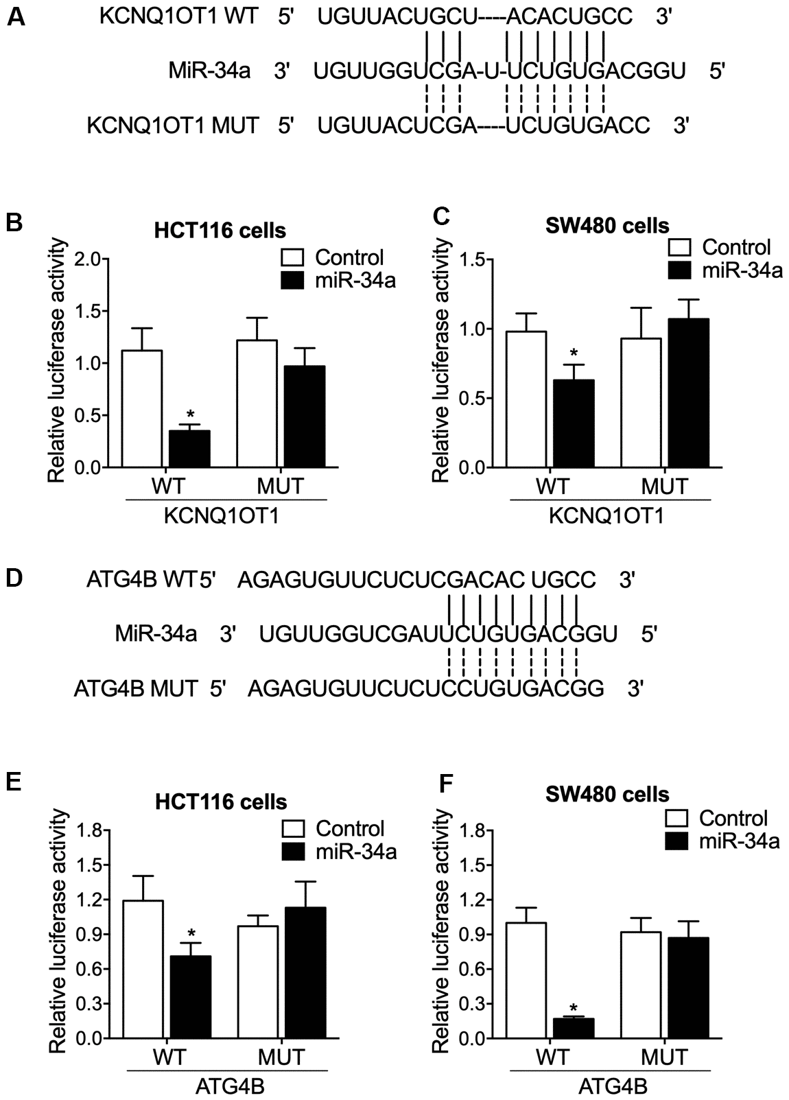 Figure 3. The luciferase activities of KCNQ1OT1 and ATG4B were repressed by miR-34a. (A) Sequence analysis indicated potential binding of miR-34a to KCNQ1OT1. (B) The luciferase activity of KCNQ1OT1 was suppressed by miR-34a in HCT116 cells (statistical analysis: one-way ANOVA; * P value < 0.05, F value = 10.17 vs. control group). (C) The luciferase activity of KCNQ1OT1 was suppressed by miR-34a in SW480 cells (statistical analysis: one-way ANOVA; * P value < 0.05, F value = 6.29 vs. control group). (D) Sequence analysis indicated potential binding of miR-34a to ATG4B. (E) The luciferase activity of ATG4B was suppressed by miR-34a in HCT116 cells (statistical analysis: one-way ANOVA; * P value < 0.05, F value = 7.24 vs. control group). (F) The luciferase activity of K ATG4B was suppressed by miR-34a in SW480 cells (statistical analysis: one-way ANOVA; * P value < 0.05, F value = 11.69 vs. control group).