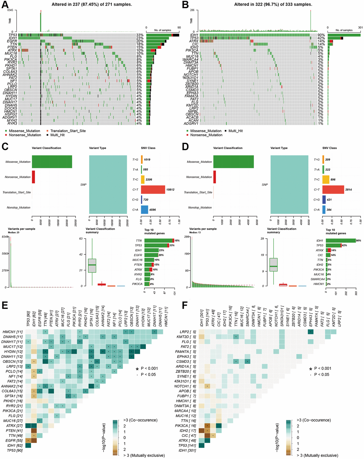 Figure 9. Landscape of mutation profiles between high- and low-risk glioma patients. (A and B) Waterfall plots showed the mutations information in each sample of high- and low-risk group glioma patients. (C and D) The variant classification in high-and the low-risk group glioma patients. (E and F) The exclusive and co-occurrence in high-and the low-risk group glioma patients.