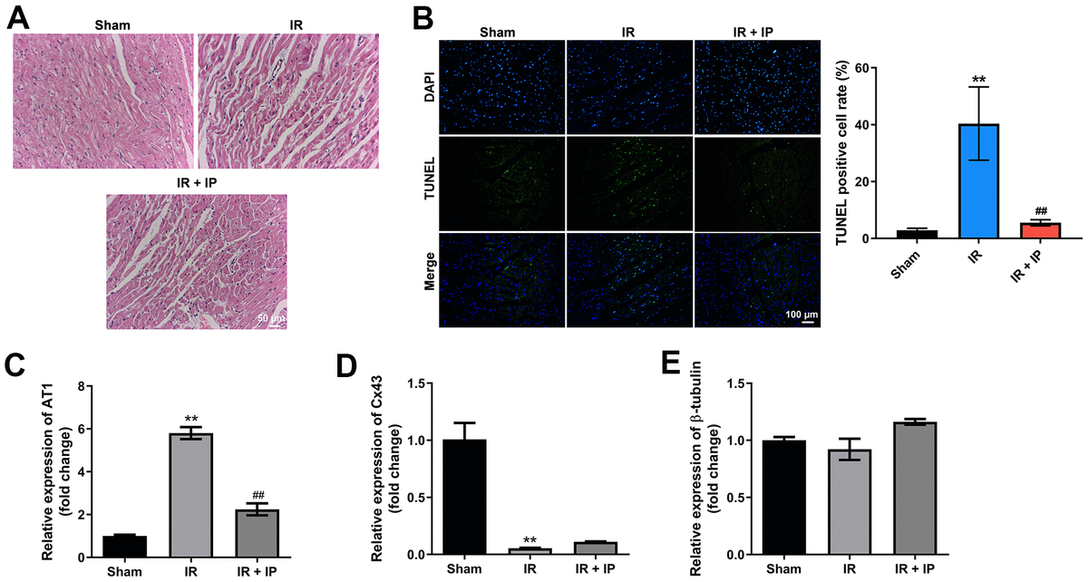 Figure 3. IP protected myocardial tissues against IR injury. (A) H&E staining assay was conducted to observe the morphology of nonculprit myocardial tissues. (B) TUNEL and DAPI staining assay was performed to detect the apoptosis of nonculprit myocardial tissues. (C–E) RT-qPCR assay was used to detect the expression of AT1, Cx43 and β-tubulin. **P<0.01 compared with the sham group; ##P<0.01 compared with the IR group.
