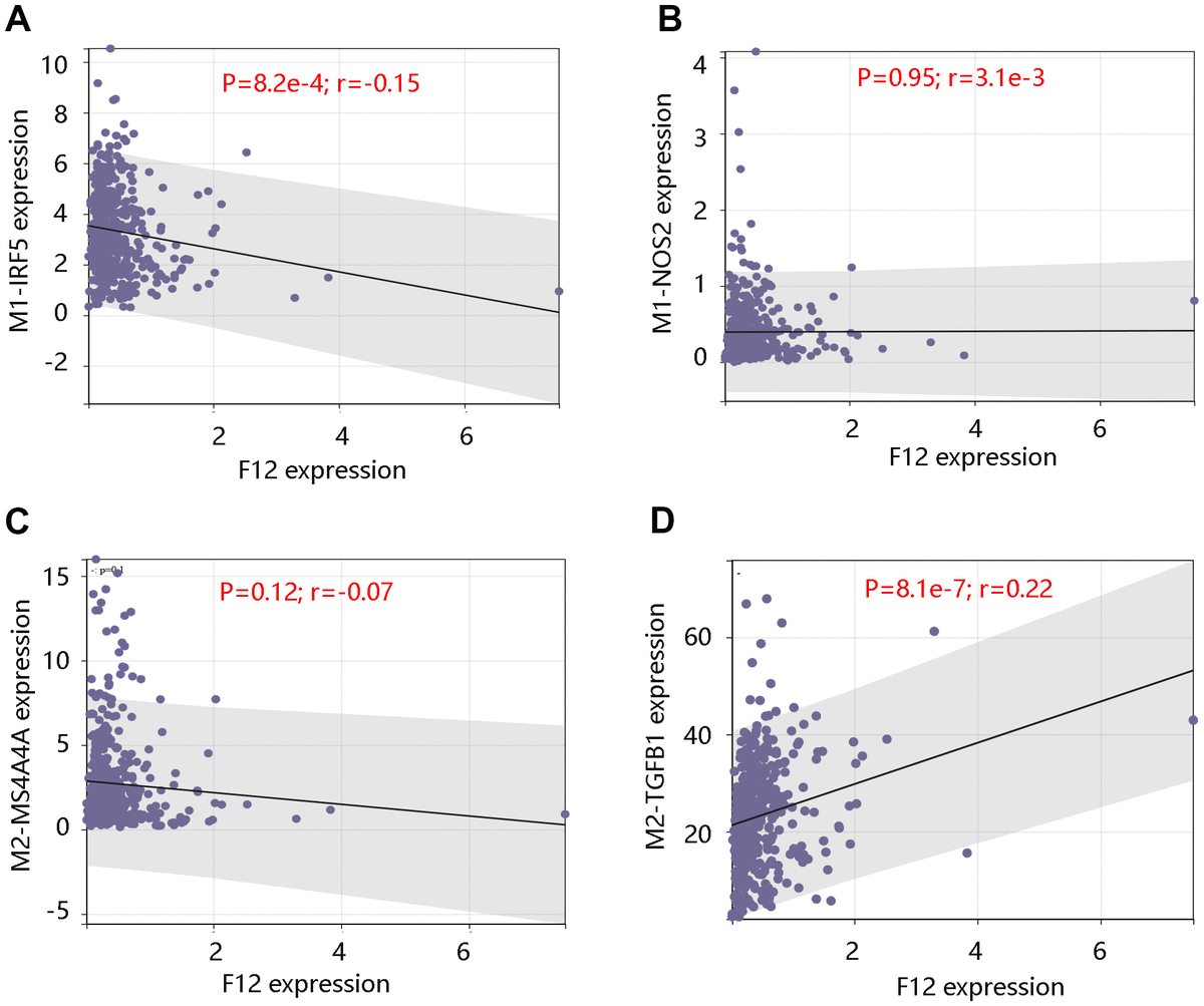 Figure 11.Correlation between F12 expression and macrophage markers. Relationship between F12 expression and M1 macrophage markers (A) IRF5 and (B) NOS2. Relationship between F12 expression and M2 macrophage markers (C) MS4A4A and (D) TGFB1.