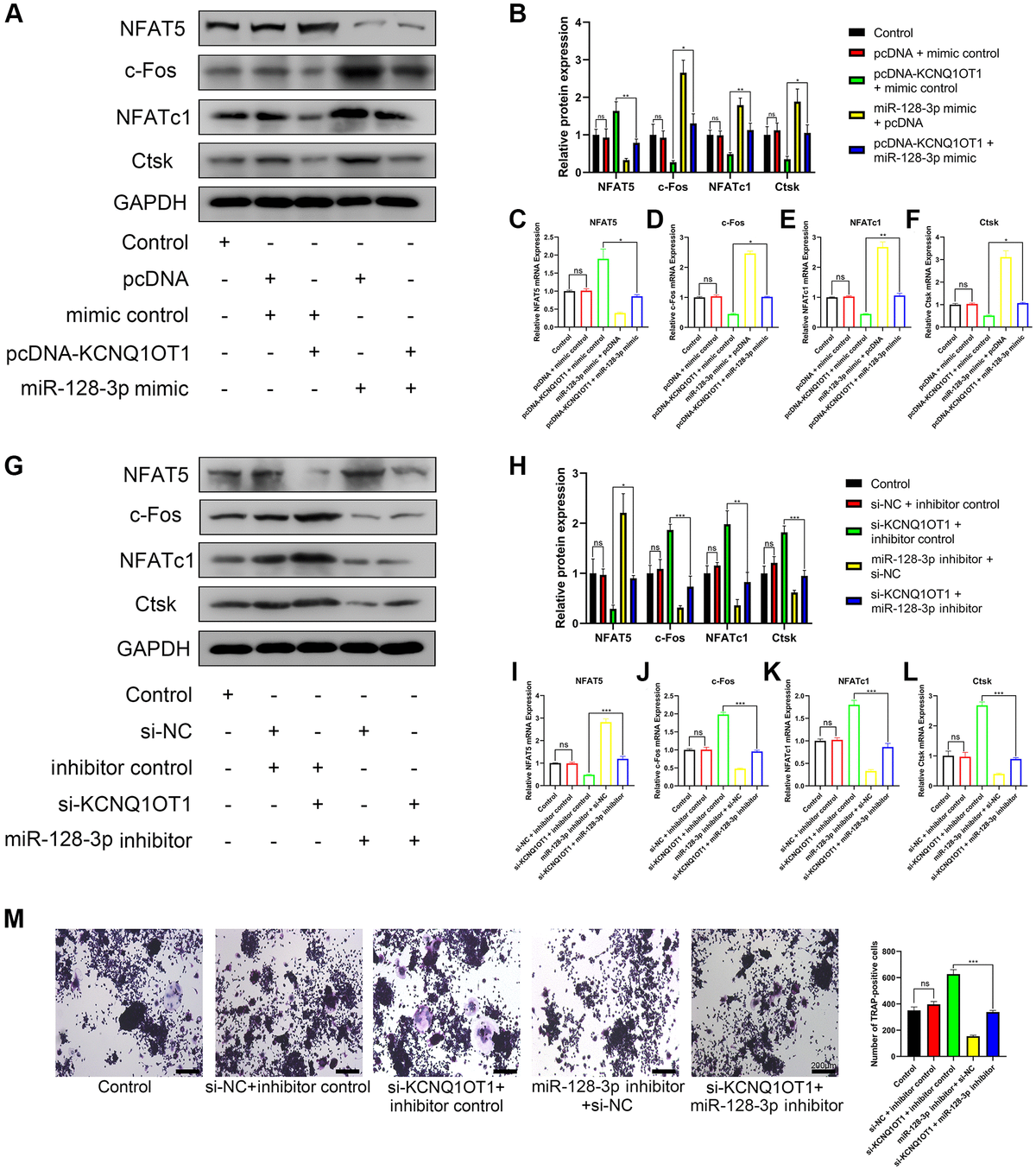 Figure 6. KCNQ1OT1 inhibits osteoclast differentiation by upregulating NFAT5 expression via sponging miR-128-3p. (A–F) RAW 264.7 cells were transfected with pcDNA-KCNQ1OT1, miR-128-3p mimic or pcDNA-KCNQ1OT1 + miR-128-3p mimic respectively, and then treated with RANKL for 5 days. qRT-PCR and Western blotting showed the mRNA and protein expression levels of NFAT5, c-Fos, NFATc1, and Ctsk. (G–L) Similar experiments were also performed in RAW 264.7 cells transfected with si-KCNQ1OT1, miR-128-3p inhibitor or si-KCNQ1OT1 + miR-128-3p inhibitor. (M) Multinucleated osteoclasts were stained by TRAP and then counted (Scale bar: 200 μm). *P < 0.05, **P < 0.01; ***P < 0.001, ns: not significant.