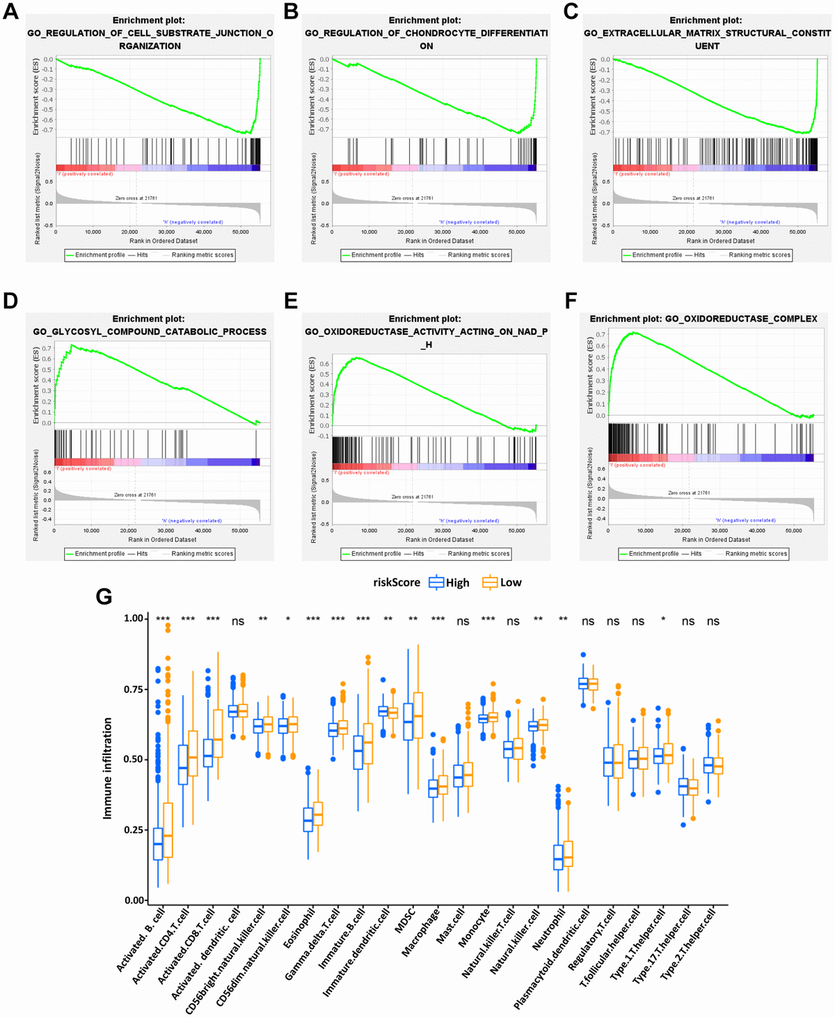 Figure 6. Enrichment plots of Gene Ontology annotation from gene set enrichment analysis (GSEA). GSEA results showed that the regulation of cell substrate junction organization (A), Regulation of chondrocyte differentiation (B), and Extracellular matrix structural constituent (C) were differentially enriched in low-risk phenotype, while Glycosyl compound catabolic process (D), Oxidoreductase activity on NADPH (E) and Oxidoreductase complex (F) were enriched in the high-risk phenotype. The expression abundance of different TME infiltrating cells in the high- and low-risk group (G). The upper and lower end of the box represented the quartile range of the value, the middle line represented the median value, and the asterisk represented the statistical p-value (*P < 0.05, **P < 0.01, ***P < 0.001).