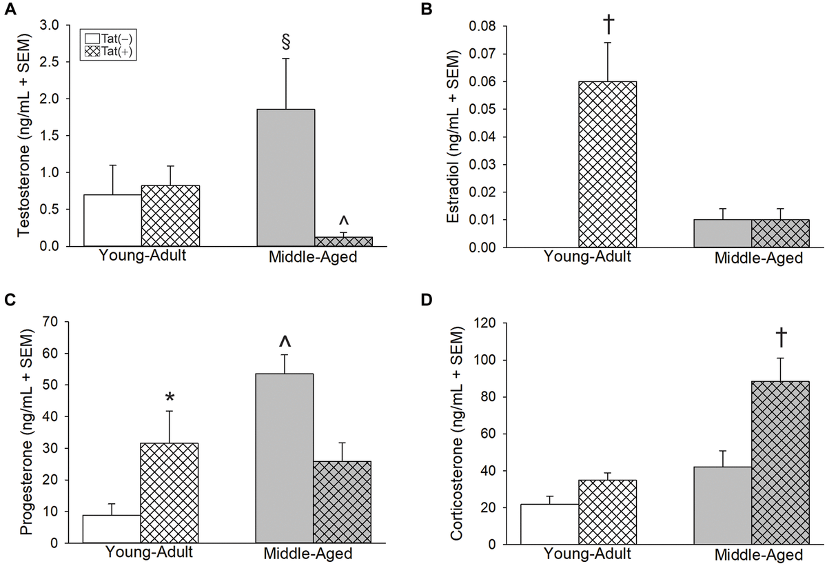 Figure 2. Circulating steroids (ng/mL) among young adult and middle-aged HIV-1 Tat-transgenic male mice [Tat(+)] or their non-Tat-expressing age-matched counterparts [Tat(−)]. (A) Testosterone, (B) estradiol, (C) progesterone, and (D) corticosterone detected in serum. §indicated group differs from young adult Tat(−) controls. ^significant interaction wherein indicated group differs from respective Tat(−) controls. †indicated group differs from all other groups. *main effect for Tat(+) mice to differ from Tat(−) controls, (two-way ANOVA, p < 0.05).