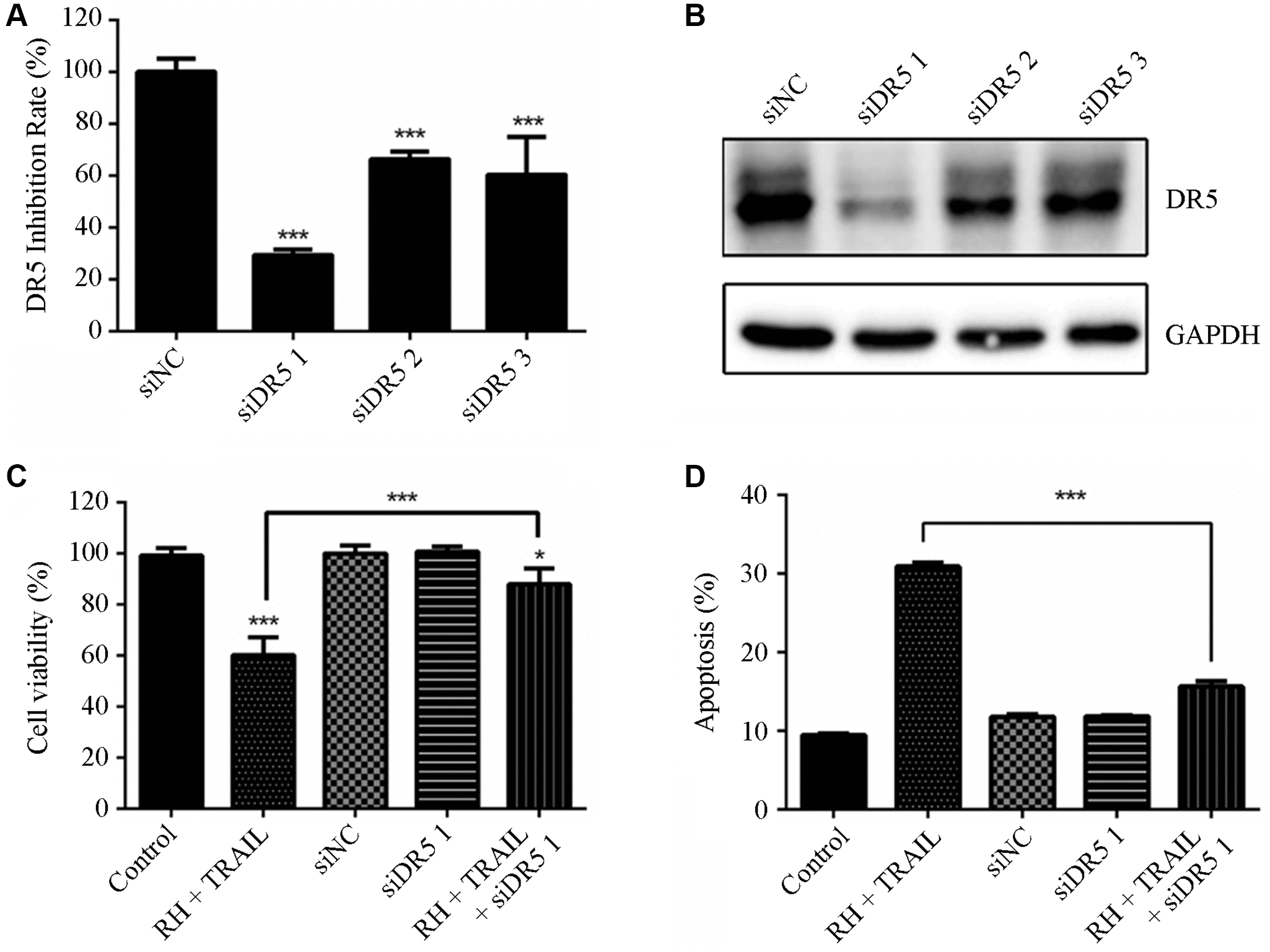 Figure 6. Effect of combination treatment RH and TRAIL on cell viability and apoptosis after silencing DR5. (A and B) Three small interfering RNA pairs were designed and verified for interference efficiency with DR5 mRNA (A) and protein expression in BIU 87 cells (B). (C and D) Transfection of TRAIL-resistant BIU 87 cells for 24 h with the siDR5 1, then RH was added. Cell viabilities were detected using CCK8 (C), and apoptosis was detected using Annexin V-FITC/PI (D). Differences between groups were examined using one-way ANOVA. The results represent the means ± SD of three replicates, *P < 0.05, ***P < 0.001.