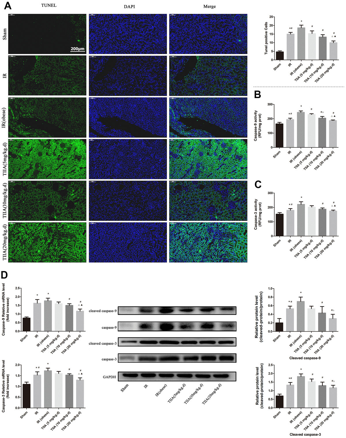 Figure 2. Tanshinone IIA (TIIA) inhibited renal cells apoptosis after renal ischemia-reperfusion (IR). Rats were pre-treated with TIIA followed by removing the right kidney and clamping of the left renal artery for 30 min and reperfusion for 24 h. Sham rats were used as control. Sham rats were used as control. Representative apoptosis of renal cells, TUNEL positive cells, the scale bars represent a length of 200 μm on histology (A), the activity of renal caspase-9/3 (B, C), and the protein expression of cleaved caspase-9/3 (D) were evaluated under different groups. Data are shown as mean ± SD. *p < 0.05 versus sham group, #p < 0.05 versus IR (obese) group, ∆p < 0.05 versus TIIA (5 mg/kg.d) group, ▲p < 0.05 versus TIIA (10 mg/kg.d) group. (n=3).