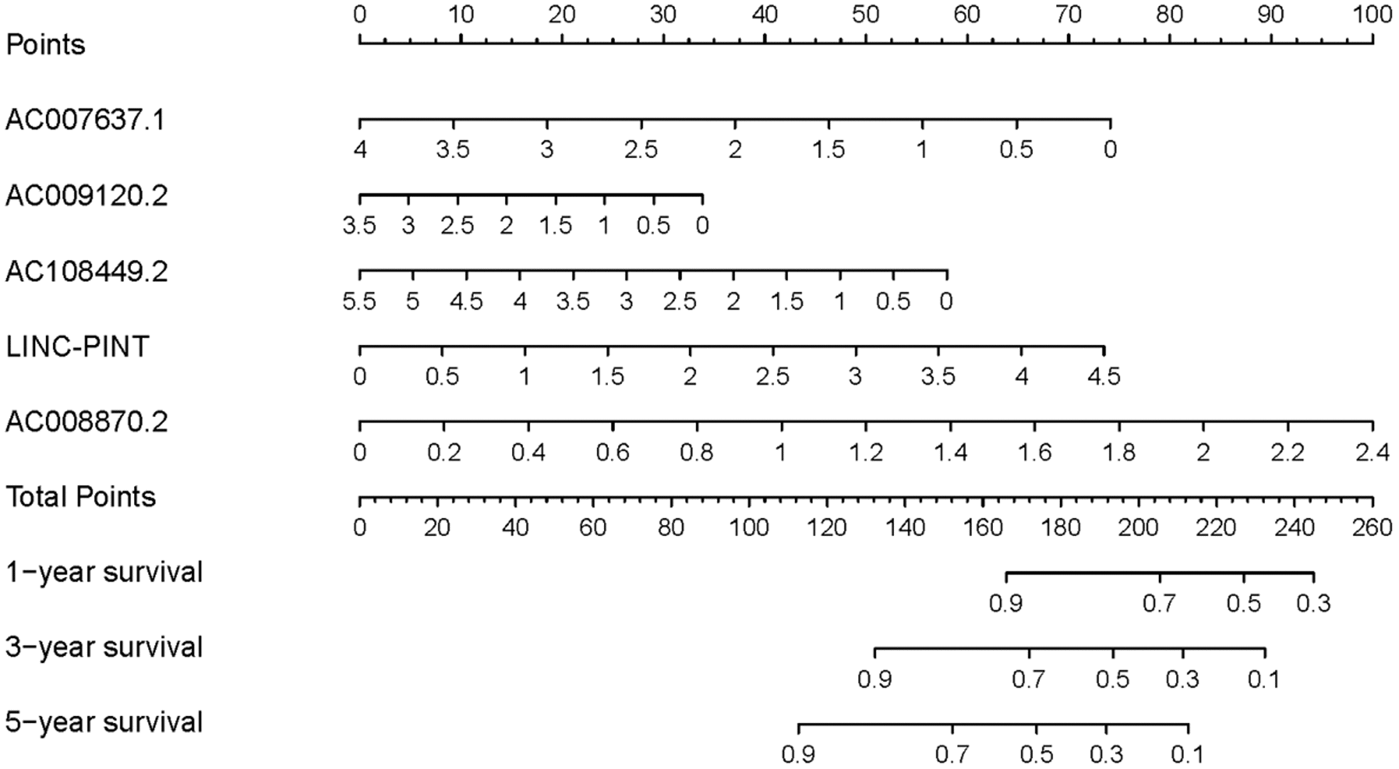 Figure 7.Clinical underlying application of SRSM. The nomogram of SRSM could predict 1-, 3- and 5-year survival probabilities of ccRCC patients by detecting the expressions of sSR-LncRs.