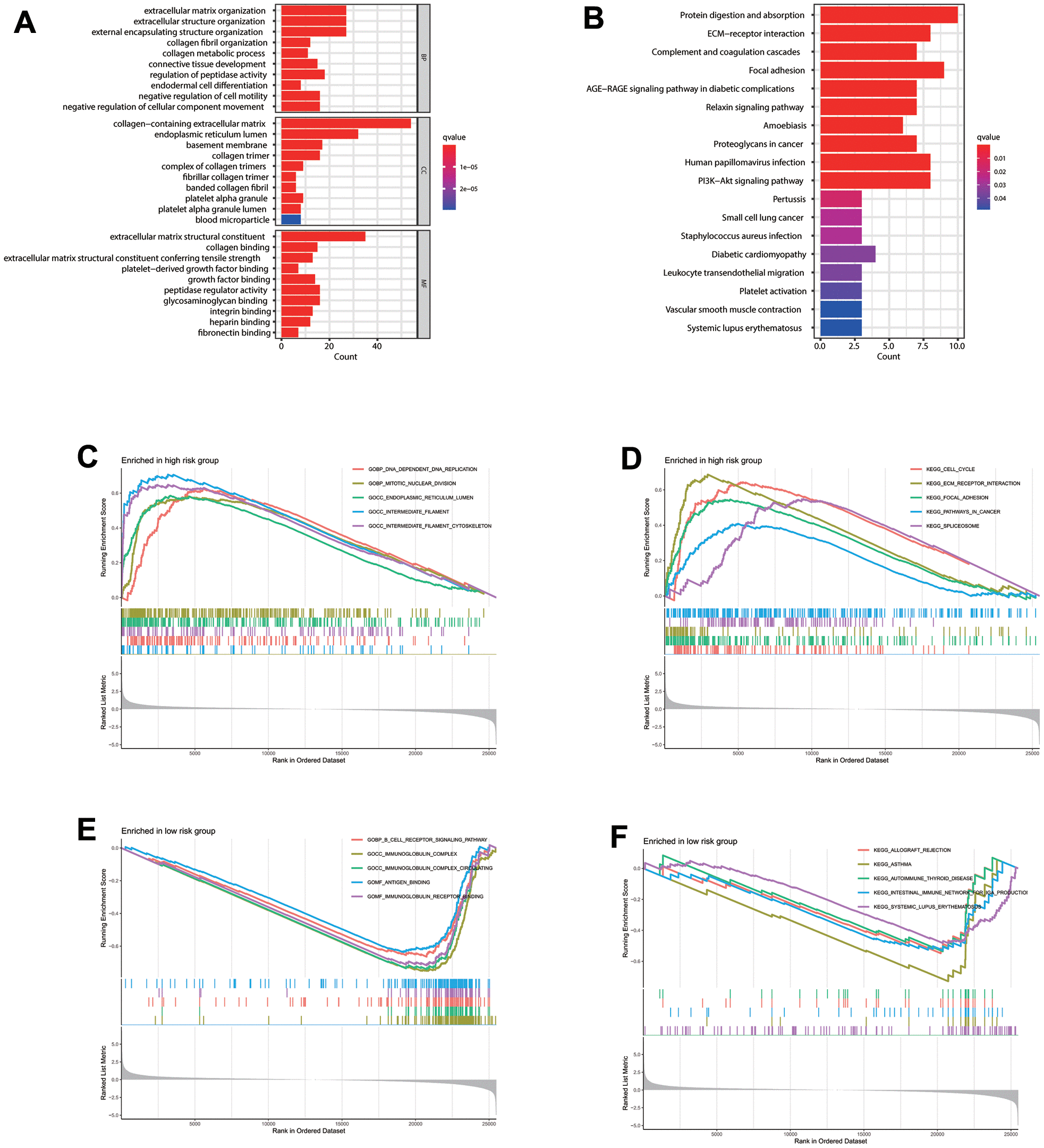 Figure 5.Enrichment analysis. (A) GO and (B) KEGG enrichment analysis of 120 CAFs-related genes. Gene Set Enrichment Analysis (GSEA) analysis for patients in the (C, D) high- and (E, F) low-risk groups.