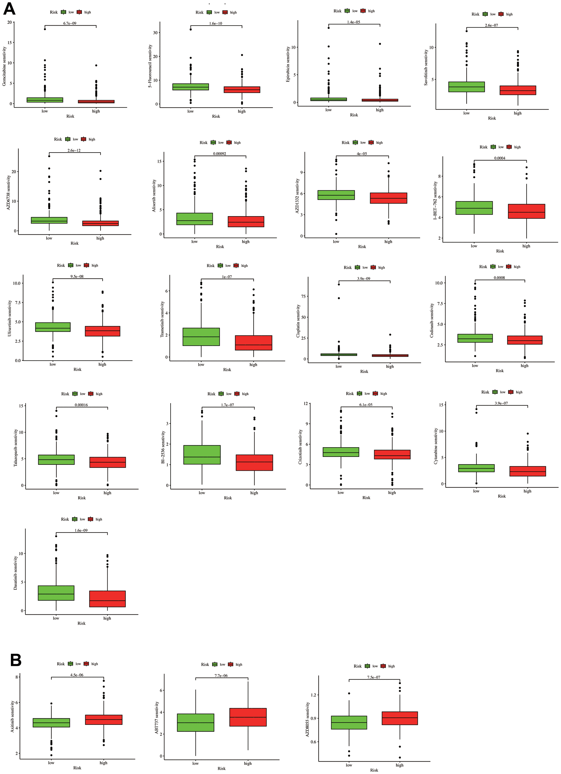 Figure 9.A drug sensitivity analysis. (A) Drugs with higher sensitivity in the low-risk group. (B) Drugs with higher sensitivity in the high-risk group.