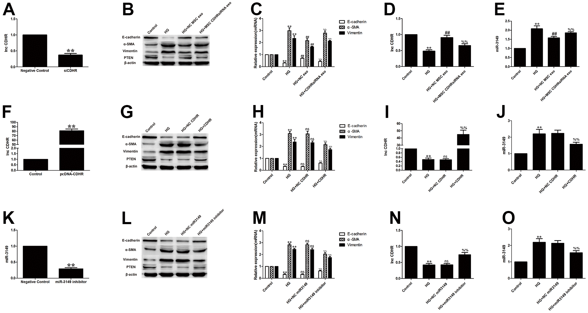 Figure 5. Exosomal lnc-CDHR of hUMSCs alleviates HG-induced EMT by down-regulating miR-3149 and up-regulating PTEN. (A) Transfection efficiency of exosomal lnc-CDHR extracted from transfected stem cells was detected by PCR. (B, C) The effect of MSC CDHR siRNA exosomes on the expression of EMT and PTEN in HG-induced HMrSV5 was detected by WB and PCR. (D, E) Lnc-CDHR and miR-3149 expression were detected by PCR after treatment of HG-induced HMrSV5 with MSC CDHR siRNA exosomes. (F) Transfection efficiency of pc-DNA CDHR was detected by PCR. (G–J) Expressions of Vimentin, α-SMA, E-cadherin, PTEN, CDHR, and miR-3149 were detected by WB and PCR after transfection of pc-DNA CDHR in HG-induced HMrSV5. (K) Transfection efficiency of miR-3149 inhibitor was detected by PCR. (L–O) To illustrate the effect of miR-3149 on EMT, changes of EMT, PTEN, CDHR, and miR-3149 were detected by WB and PCR after miR-3149 inhibition. Each value represents the mean ± SEM (n=3) (**P<0.01 vs. Control, ##P<0.01 vs. HG, ns no significance vs. HG, (C–E) %%P<0.01 vs. HG+NC exo, (H–J) %%P<0.01 vs. HG+NC CDHR, (M–O) %%P<0.01 vs. HG+NC miR3149).
