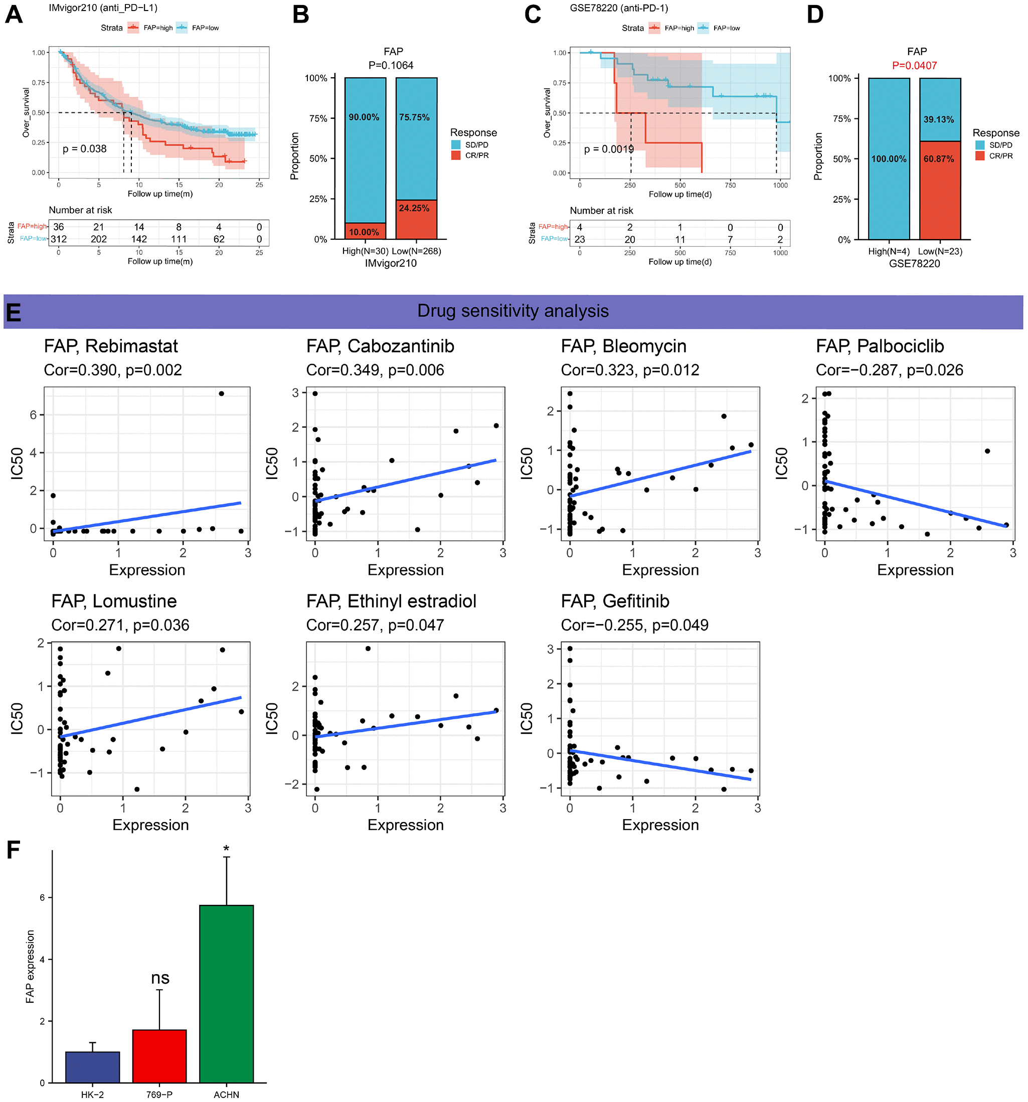 Figure 13. Immunotherapy prediction analysis and drug sensitivity analysis. (A) Kaplan-Meier analysis of the association between FAP expression and OS in the IMvigor210 cohort. (B) The proportion of BLCA patients who responded to anti-PD-L1 therapy in the groups with the low and high FAP expression. (C) Kaplan-Meier analysis of the association between FAP expression and OS in the GSE78220 cohort. (D) The proportion of SKCM patients who responded to anti-PD1 therapy in the groups with the low and high FAP expression. (E) An illustration of the relationship between FAP expression and expected medication response. (F) The mRNA expression levels of FAP in different cell lines (HK-2, 769-P, ACHN) were measured by RT-qPCR.