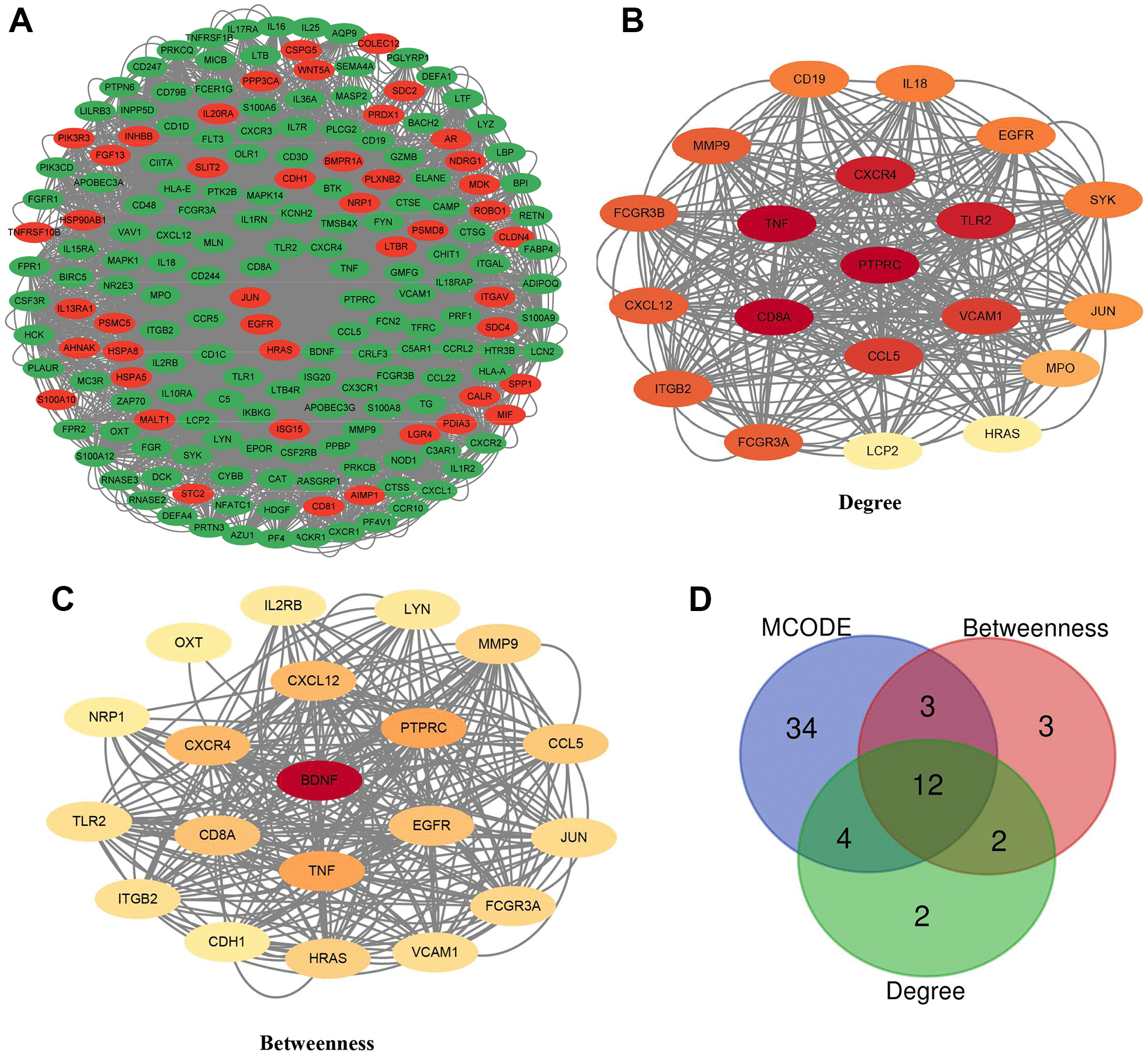 Figure 3. Hub genes and the biology network for differentially expressed IRGs in GSE32269. (A) A total of 197 IRGs were used for drawing the PPI network. Red indicated up-regulated, and green indicated down-regulated IRGs in bone metastasis tissues of prostate cancer. (B, C) Confirmation of the top 20 IRGs and establishment of the PPI network by degree and betweenness topological methods. (D) Venn diagram to determine 12 hub IRGs.