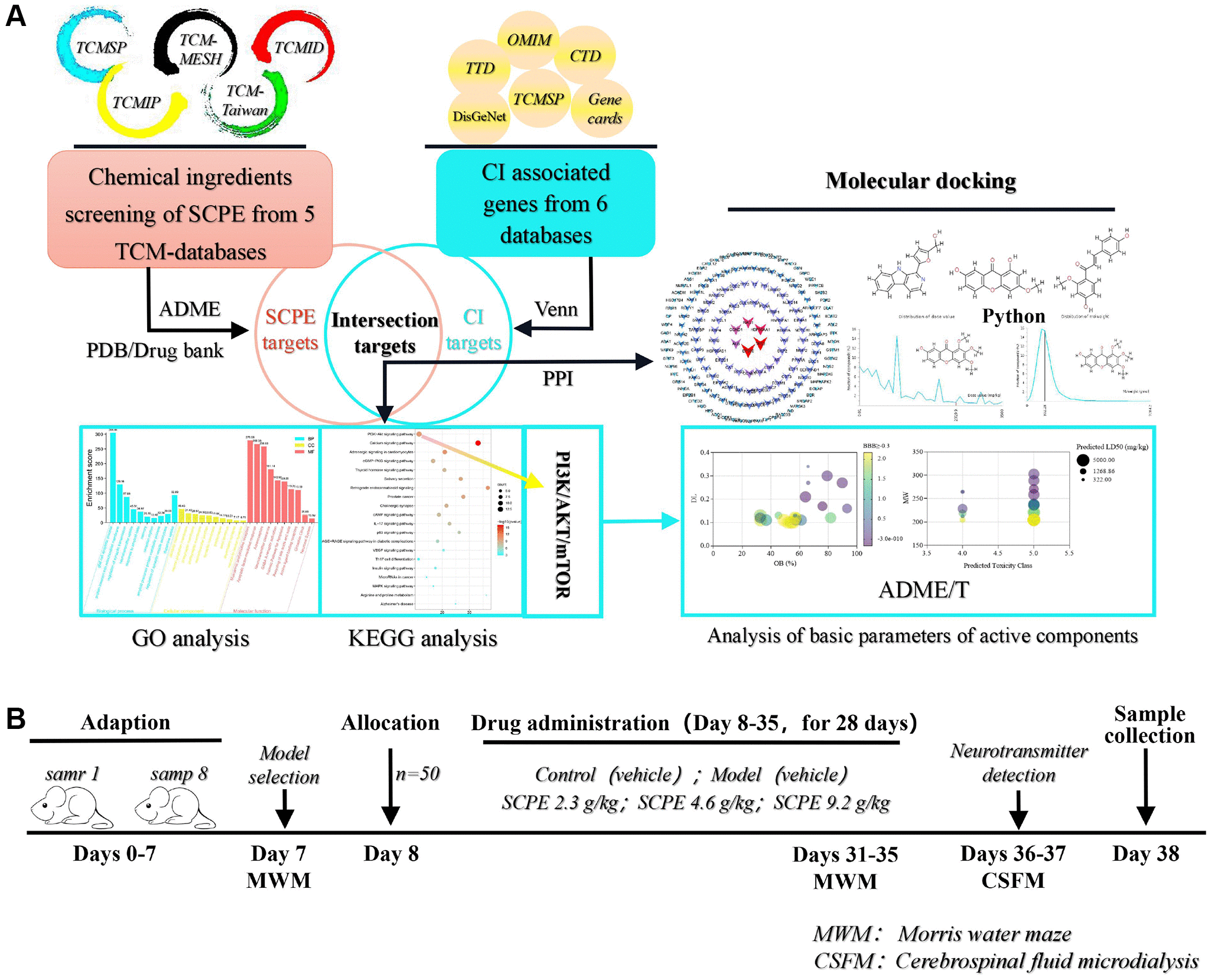 Figure 13. Schematic diagram of the systems pharmacology and experimental protocol. (A) Flowchart of the systems pharmacology approach for deciphering the therapeutic mechanisms of action of Sagacious Confucius’ Pillow Elixir (SCPE) in cognitive impairment (CI). (B) Flowchart of the experimental protocol.