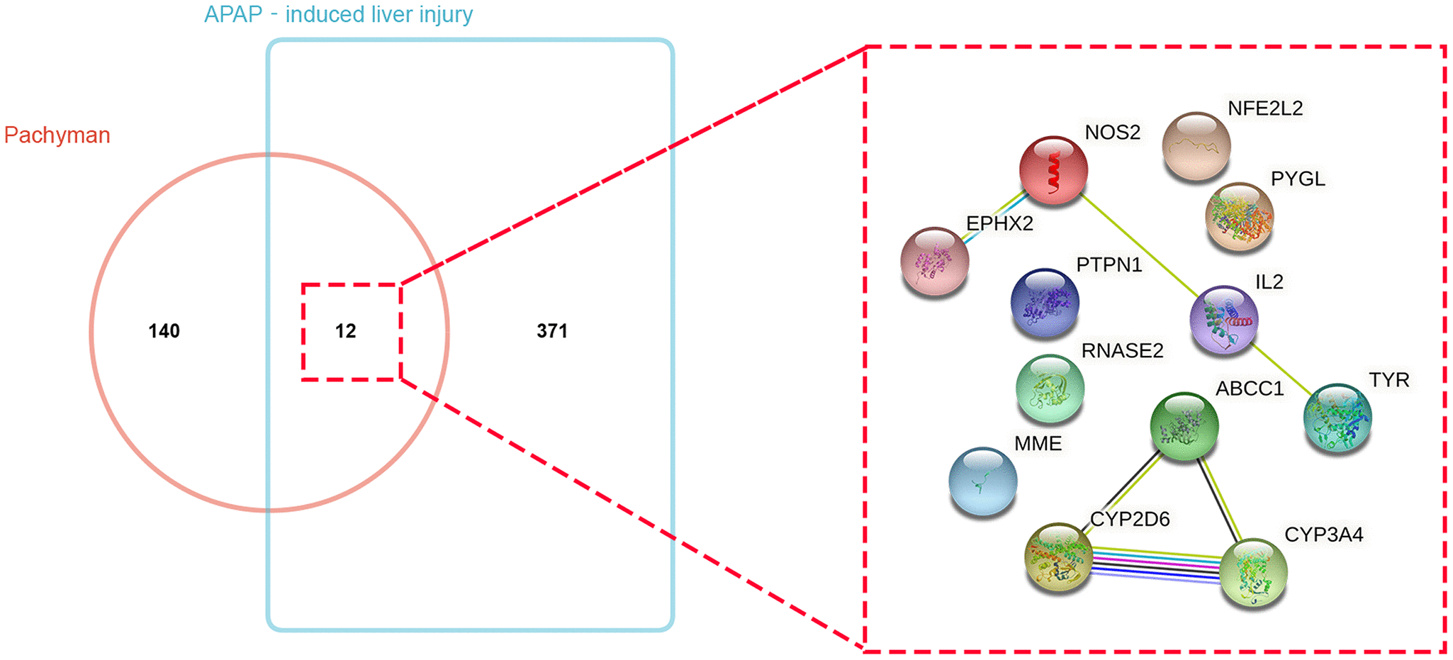 Figure 1. Bioinformatics and Venn mapping analyses showed 152 and 383 respective genes in pachyman and APAP-induced liver injury, and 12 intersection genes were identified and gene interaction network diagram of 12 potential targets was visualized.