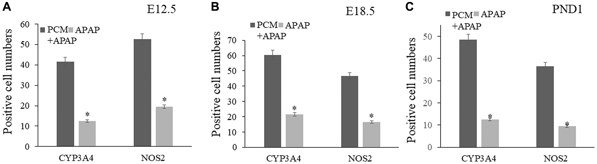 Figure 7. Pachyman-treated livers from prenatal APAP exposure resulted in elevated positive expressions of CYP3A4, and NOS2 in E12.5 livers (A), E18.5 livers (B), and PND1 livers (C). Abbreviation: PCM: pachyman treatment.