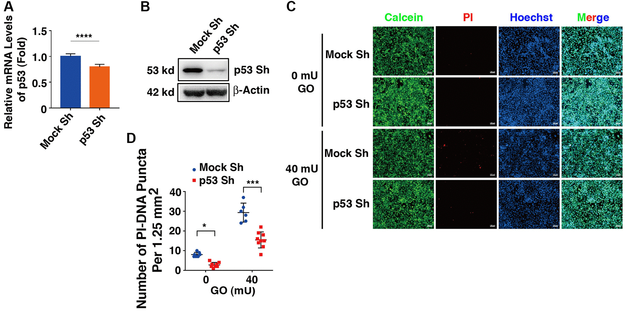 Figure 8. Knockdown of p53 abrogates DBC1 promotion of oxidative stress-induced apoptosis. (A) qRT-PCR analysis of the mRNA expression level of p53 in FHL124 cells transfected with Mock Sh or p53 Sh. Ct values were normalized by β-actin for each sample. (B) Western blot analysis of the protein expression level of p53 in Mock Sh and p53 Sh cells. The β-actin was used as a loading control. (C) The Mock Sh and p53 Sh cells were transfected with wildtype DBC1. 24 hours after transfection, the cells were treated with and without 40 mU GO for 5 hours, then Calcein/PI Cell Viability/Cytotoxicity assay was used to analyze cell apoptosis. Scale bar, 100 μm. (D) Quantification of the PI-DNA puncta in panel (C). *p < 0.05, ***p < 0.001, ****p < 0.0001.