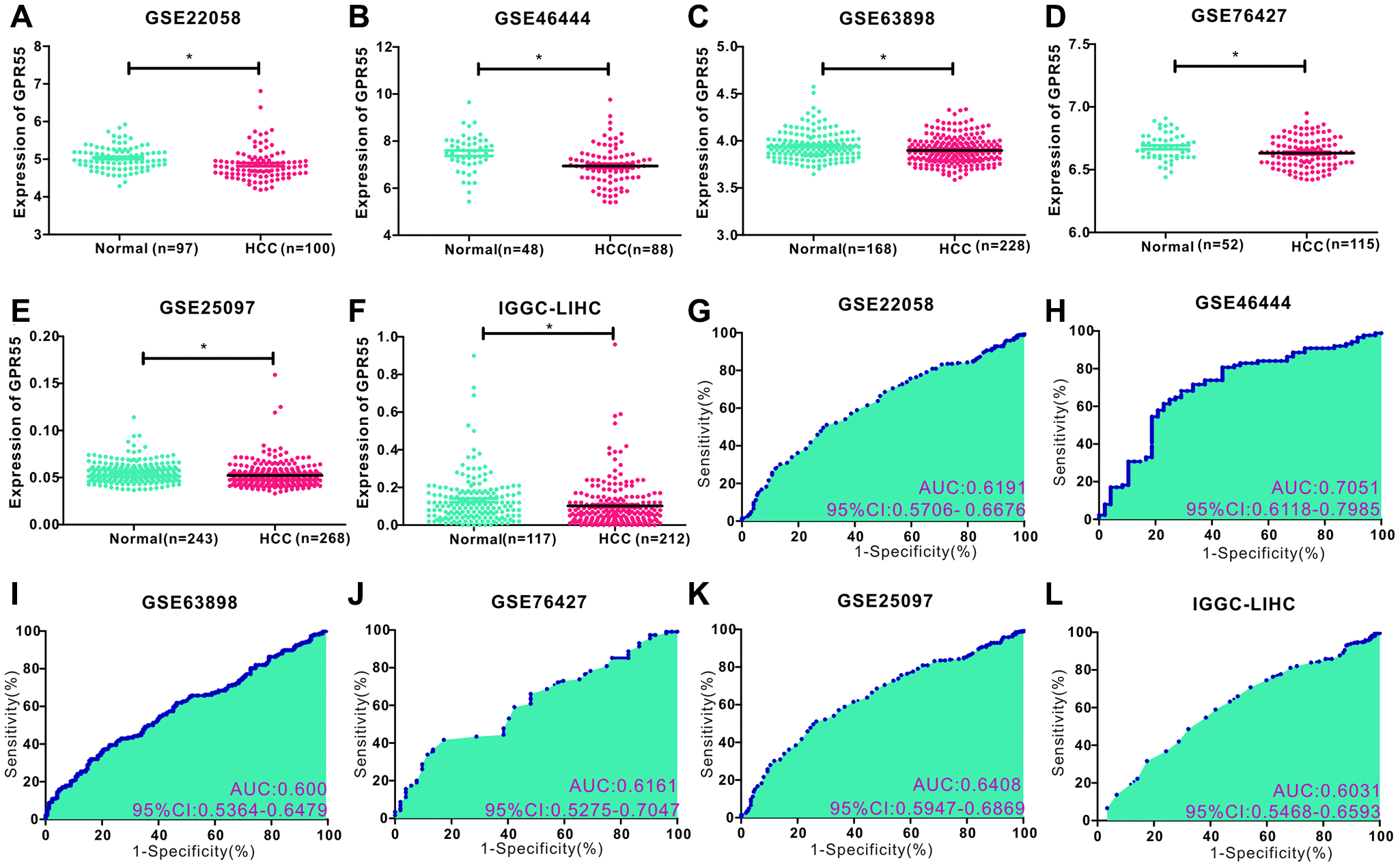 Figure 1. (A–F) Comparison of GPR55 expression in normal and tumor tissues in different HCC data sets (GSE22058, GSE46444, GSE63898, GSE76427, GSE25097, IGGC-LIHC) (*P < 0.05). (G–L) ROC diagnostic curve of GPR55 in different data sets.
