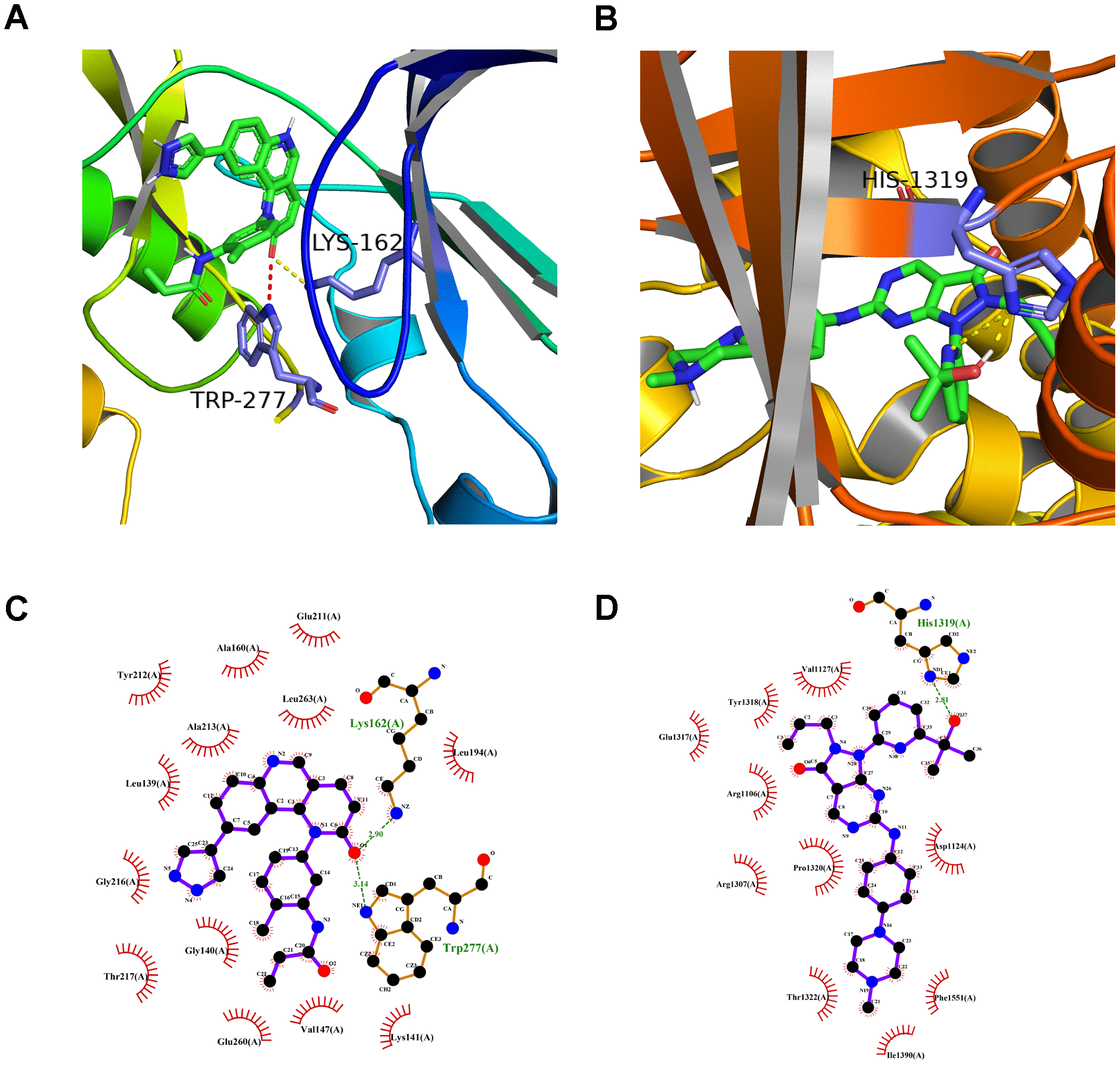 Figure 8. The molecular docking mode of small compounds and proteins. (A) The three-dimensional structure of interaction between QL-X-138 and AURKA. (B) MK-1775 and DUOX1. (C) The two-dimensional structure of interaction between QL-X-138 and AURKA. (D) MK-1775 and DUOX1. The yellow dotted line represents the hydrogen bond, while the red dotted line represents the pi-cation bond.