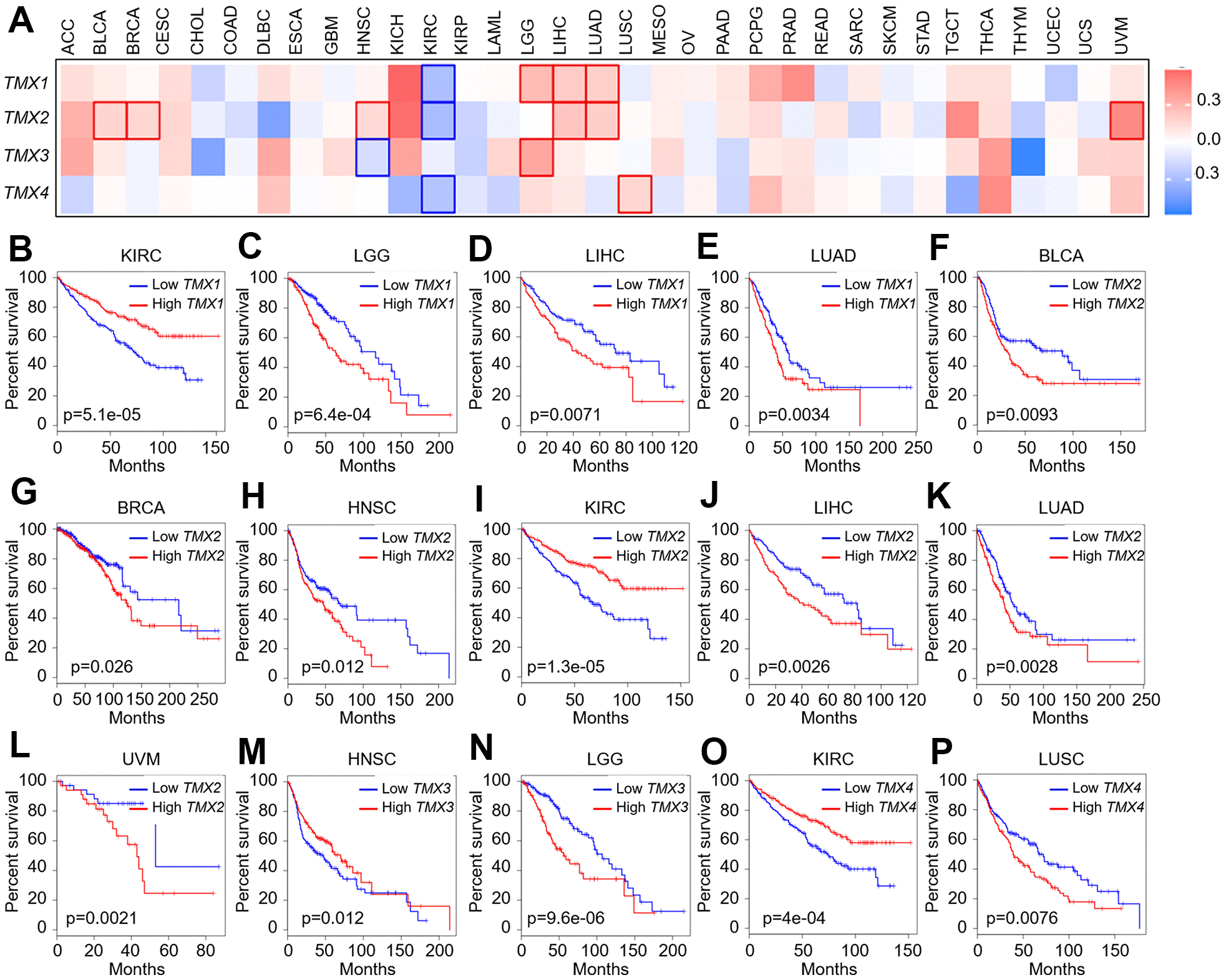 Figure 2. Correlation analysis of TMX family gene expression and overall survival rate in patients with different TCGA tumor types. Using GEPIA2 to construct a survival map of TMX family gene expression (A). The OS curve of TMX1 in different tumors: KIRC (B); LGG (C); LIHC (D); LUAD (E). The OS curve of TMX2 in different tumors: BLCA (F); BRCA (G); HNSC (H); KIRC (I); LIHC (J); LUAD (K); UVM (L). The OS curve of TMX3 in different tumors: HNSC (M); LGG (N). The OS curve of TMX4 in different tumors: KIRC (O); LUSC (P). The expression of TMX family genes was distinguished by different color lines. Red lines indicated high expression, and blue lines indicated low expression.