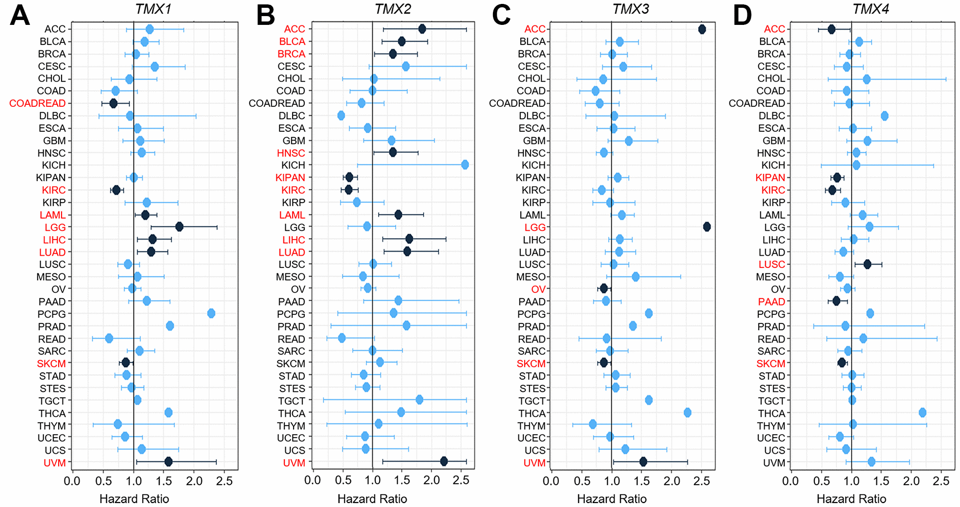Figure 3. Univariate Cox expression analysis of the relationship between TMX genes expression and OS rate in 36 different tumors. Cox analysis of the correlation with TMX1 expression in different cancer types (A). Cox regression analysis of TMX2 expression in different types of tumors (B). The correlation between Cox analysis and TMX3 expression in different cancer types (C). Cox regression analysis of TMX4 expression in different types of tumors (D). The red words indicates that the gene is a risk factor in the corresponding tumor.