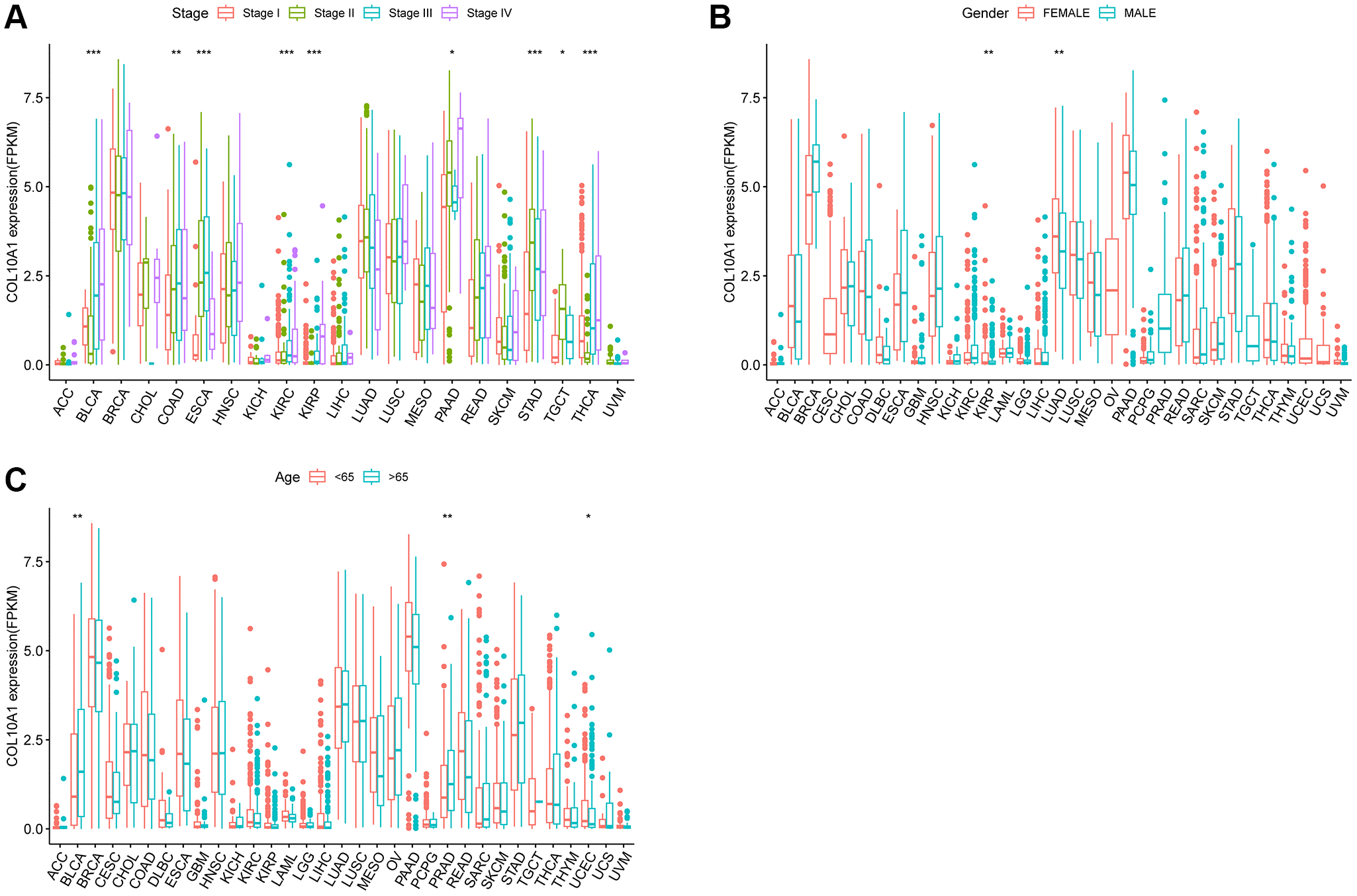 Figure 6.Relationship between COL10A1 expression and clinical character. Correlation between tumor stage and COL10A1 (A). Correlation between gender and COL10A1 (B). Correlation between age and COL10A1 (C). *p < 0.05, **p < 0.01 and ***p < 0.001.