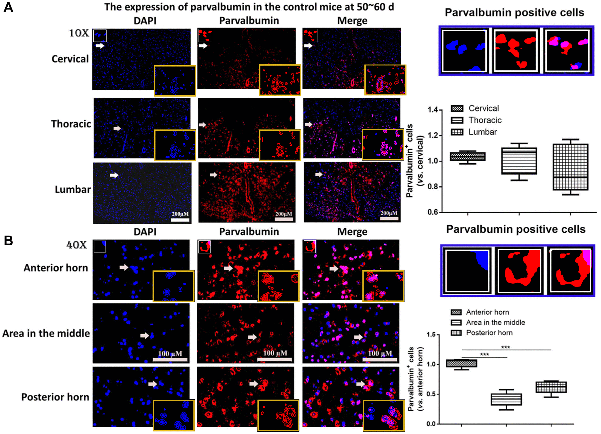 Figure 1. The expression of parvalbumin (PV) in different positions of spinal cord. (A) The expression of PV in cervical, thoracic and lumbar segments in the control mice. Scale bar = 200 μM. The yellow boxes represent the typical PV positive cells (enlarged approximate twice on the original position). The typical PV positive cells are enlarged approximate 4 times and shown on the top right panel. (B) The expression of PV in the anterior horn of gray matter, posterior horn and the area in the middle of gray matter in the control mice. The yellow boxes represent the typical PV positive cells (enlarged approximately twice on the original position). The typical PV positive cells are enlarged approximately 4 times and shown on the middle right panel. Scale bar = 100 μM. ***P < 0.001. In all experiments, half male and half female mice were used in each group (n = 6).