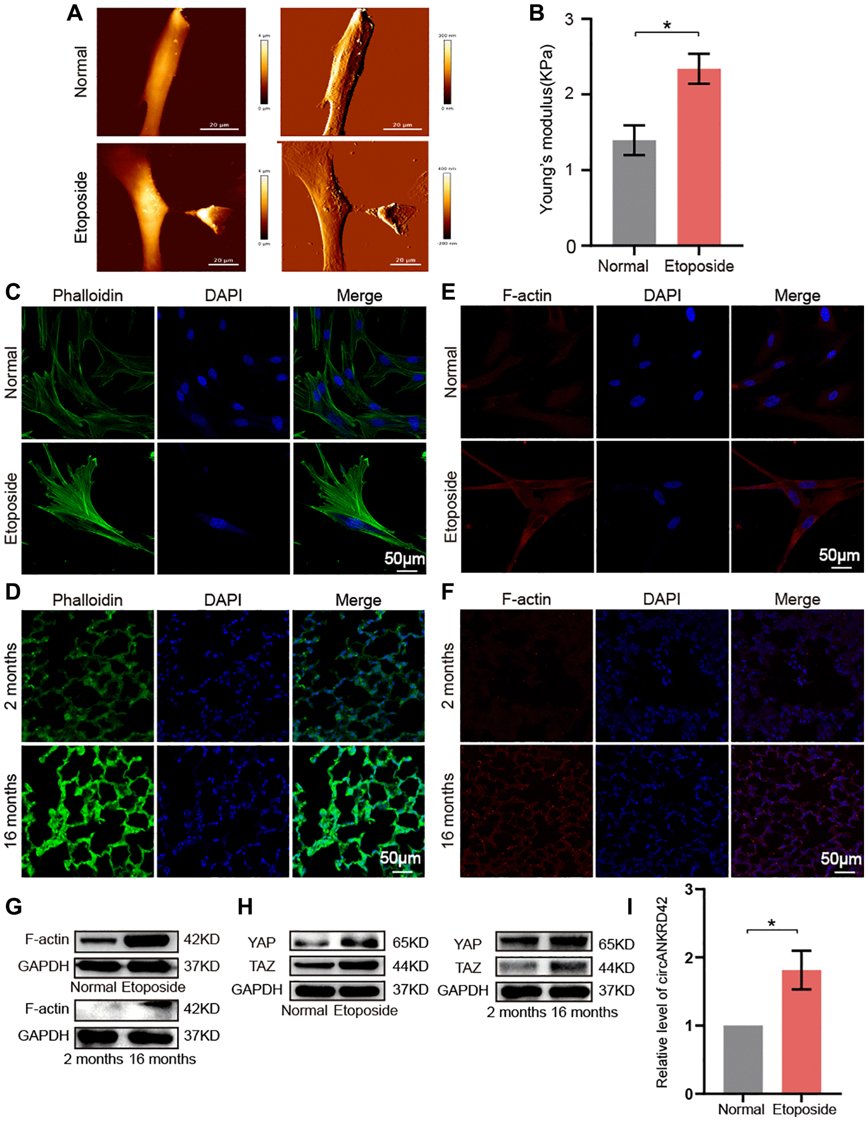 Figure 7. circANKRD42 mediated the aging-inducing mechanical forces. (A) AFM images showed that Young’s modulus increased in senescent cells compared with normal ones. (B) The reaction force of senescent cells was higher than that of normal cells. (C) Phalloidin staining depicted that the cytoskeleton became disordered and underwent disorganized expansion in the aging cell model compared with that in the normal one. (D) Phalloidin staining depicted that the cytoskeleton became disordered and underwent disorganized expansion in the lung tissue of 16-month-old mice compared with the 2-month-old ones. (E) Immunofluorescent staining showed that F-actin was highly expressed in aging cells compared with that in the normal one. (F) Immunofluorescent staining showed that F-actin was highly expressed in aging lung tissue than in the young. (G) Western blot showed that the expression level of F-actin increased in the aging cell and tissue model compared with those in the normal one. (H) Western blot showed that the expression levels of YAP and TAZ increased in the aging cell and tissue model compared with those in the normal one. (I) qRT-PCR result revealed that circANKRD42 expression increased in the aging cell model compared with those in the normal one. Each bar represents the mean ± SD; n = 3; *p < 0.05.