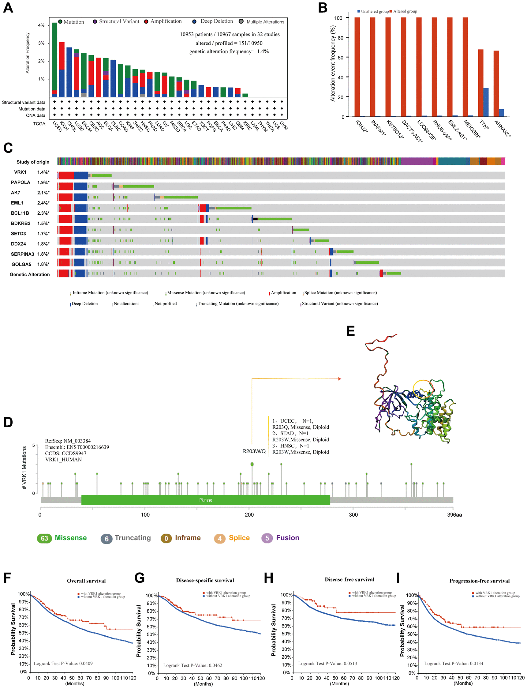 Figure 3. Mutation information of VRK1 in pan-cancer. (A) Histogram showing VRK1 alteration frequency and mutation type in various cancers. (B) Bar plot showing the frequencies of ten genes (IGHJ2, INAFM1, KBTBD13, DACT3-AS1, LOC93429, RNU6-66P, EML2-AS1, MEIOSIN, TTN, and AHNAK2) alteration cooccurrence with VRK1 alteration. (C) Waterfall plot showing the cooccurrence pattern of VRK1 alteration with genetic alterations of PAPOLA, AK7, EML1, BCL11B, BDKRB2, SETD3, DDX24, SERPINA3 and GOLGA5. (D) Mutation sites are displayed in the VRK1 structural domain. (E) The highest alteration frequency (R203W/Q) was displayed in the 3D structure of VRK1 (labeled in yellow). (F–I) The possibility of a link between VRK1 mutation status and overall survival (F), disease-specific survival (G), disease-free survival (H), or progression-free survival (I).