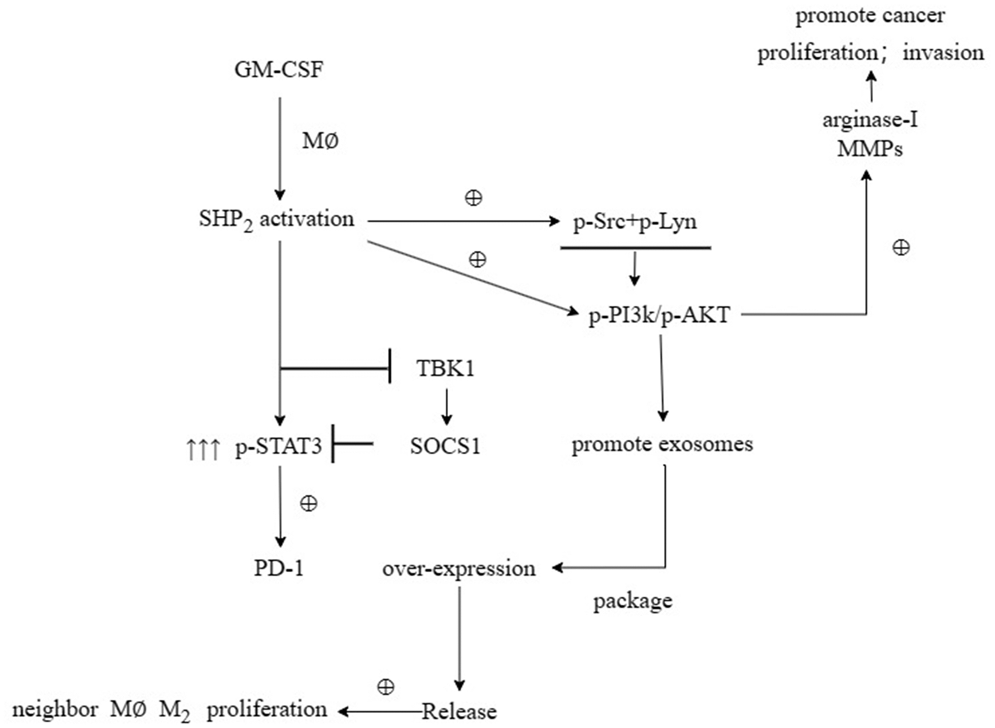 Figure 8. M-CSF secreted by gastric cancer cells promotes SHP2 in TAM to increase the secretion of exosomes, and also promotes the secretion of MMPs and Arginase-1 through the Src/PI3K/AKT axis, thereby promoting the M2 polarization and migration and invasion ability of TAM.