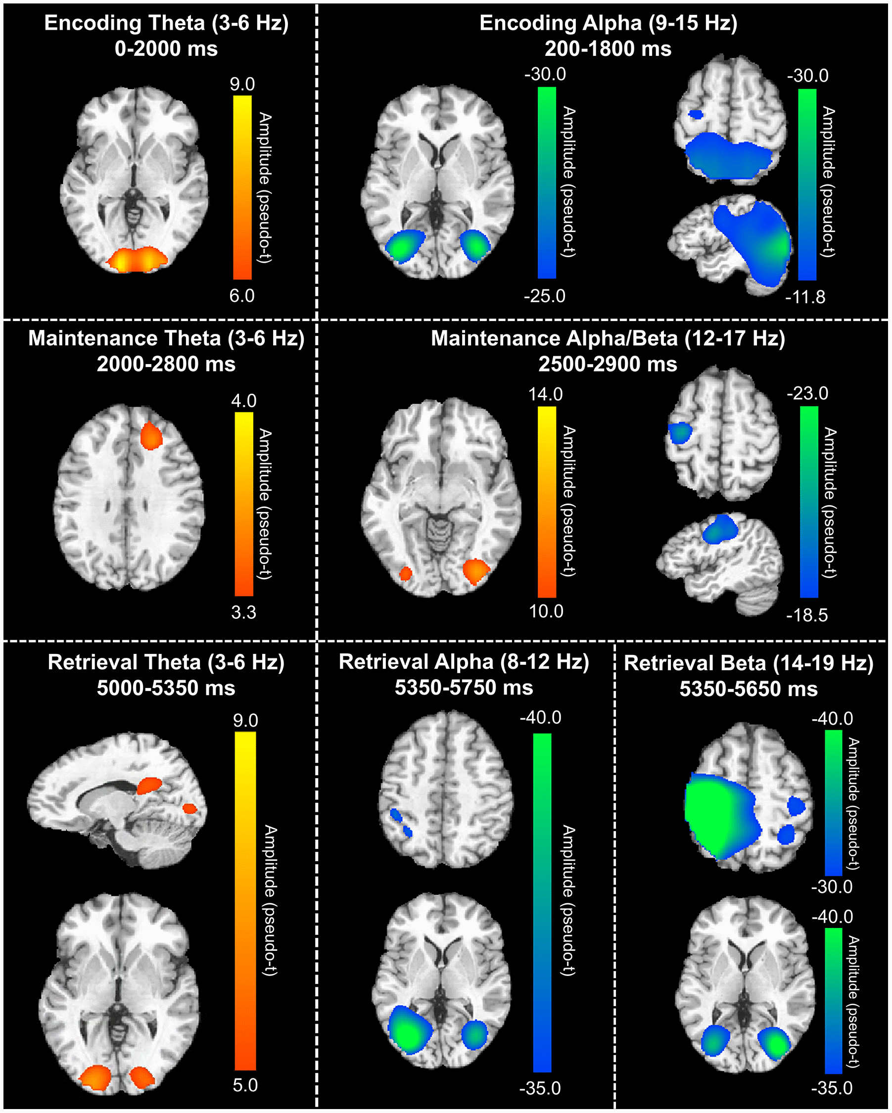 Figure 3. Grand-averaged beamformer images (pseudo-t) across all participants for theta (left) and alpha/beta (right) bands. During the encoding phase (top), there were increases in theta band amplitude relative to baseline in the primary visual cortex and decreases in alpha band activity (i.e., more negative relative to baseline) in the lateral occipital cortices, parietal cortices, and left hemisphere frontal cortex (including language areas). During the maintenance phase (middle), theta increases were limited to the right dlPFC and decreased alpha/beta activity in the left hemisphere frontal cortex (relative to baseline) was largely sustained. Additionally, a decrease in alpha/band activity relative to the baseline was observed in the lateral occipital cortices during the maintenance phase. During the retrieval phase (bottom), theta band activity increased in the right posterior cingulate gyrus and bilateral primary visual cortices, while alpha activity decreased (i.e., became more negative) in the lateral occipital cortices, left SMG, and left angular gyrus. Finally, decreased beta activity (i.e., more negative relative to baseline) in the bilateral primary motor cortices, lateral occipital cortices, and right superior parietal lobe was observed.