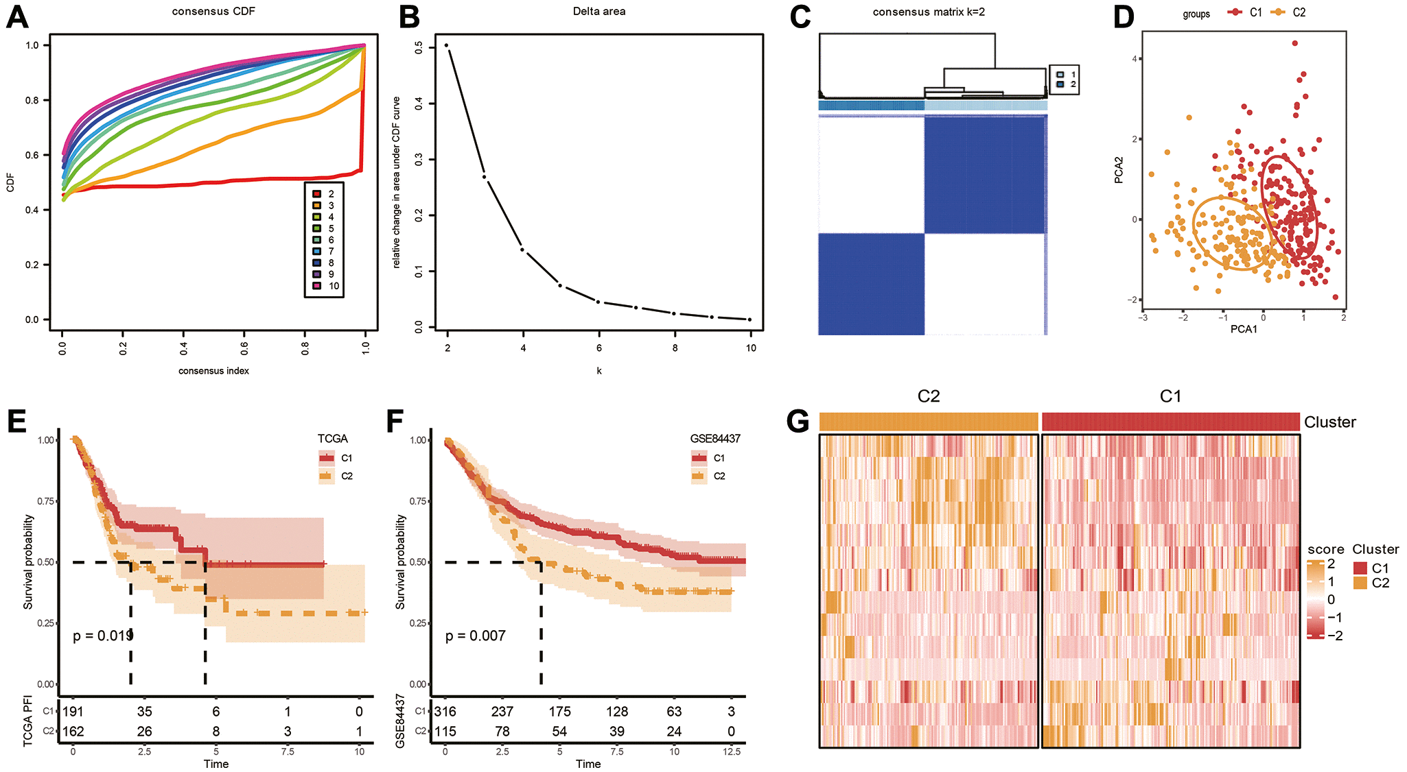 Figure 2. Identification of molecular subtypes. (A) Cumulative distribution function. (B) Delta area. (C, D) Heatmap and PCA plots of sample clustering when k = 2 in TCGA-STAD. (E, F) K-M survival analysis of C1 and C2 in TCGA-STAD and GSE84437 datasets. (G) Expression levels of 14 genes in C1 and C2 subtypes based on TCGA-STAD dataset.