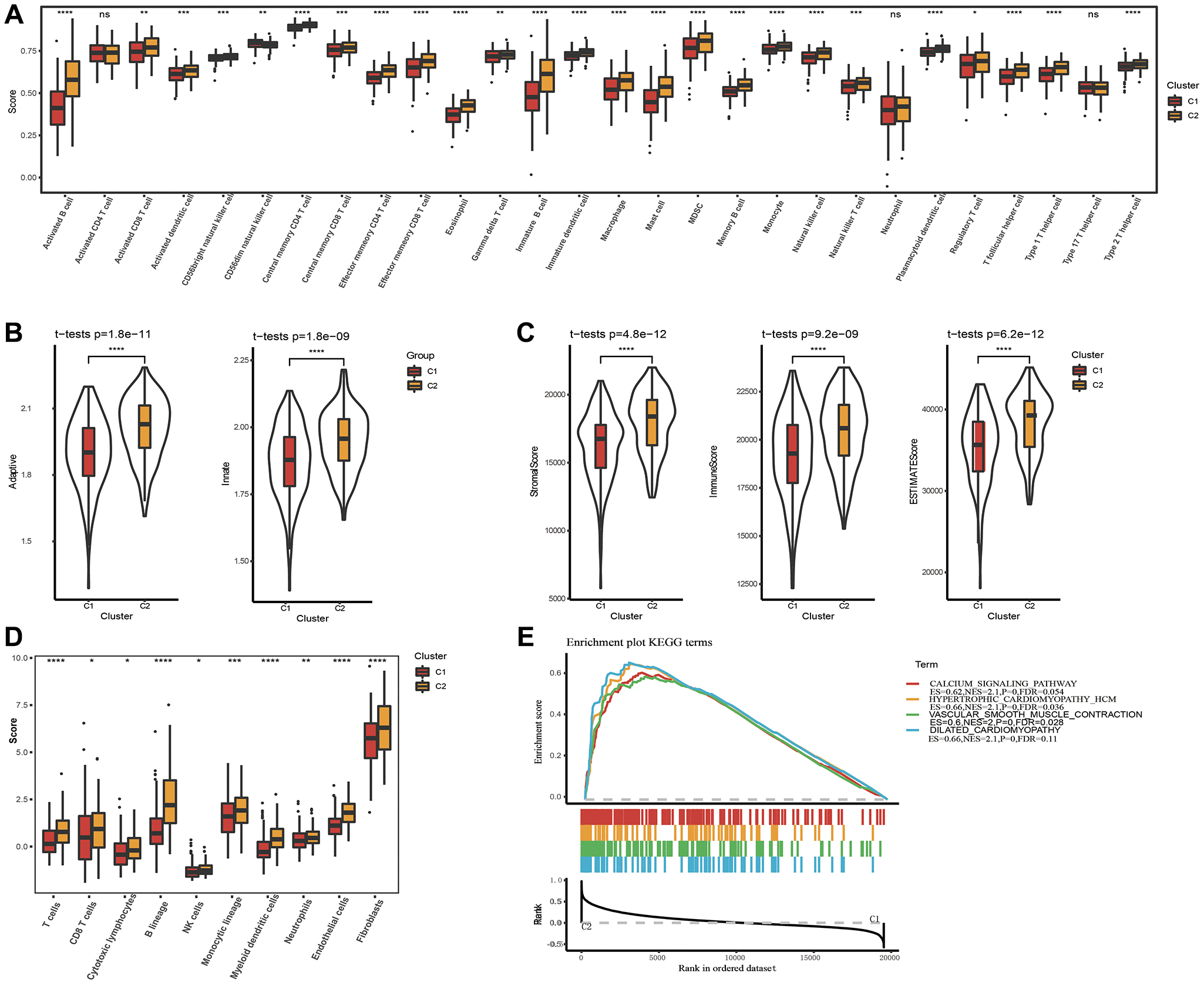 Figure 3. Analysis of immune infiltration and gene set enrichment analysis. (A) Analysis of 28 immune cells using CIBERSORT. (B) The distribution of innate and acquired immunity in TCGA-STAD dataset. (C) Analysis of immune infiltration using ESTIMATE. (D) Analysis of immune infiltration using MCP-counter. (E) GSEA pathways score analysis between C1 and C2 in TCGA-STAD. *p < 0.05, **p < 0.01, ***p < 0.001, ***p < 0.0001. Abbreviation: ns: no significance.