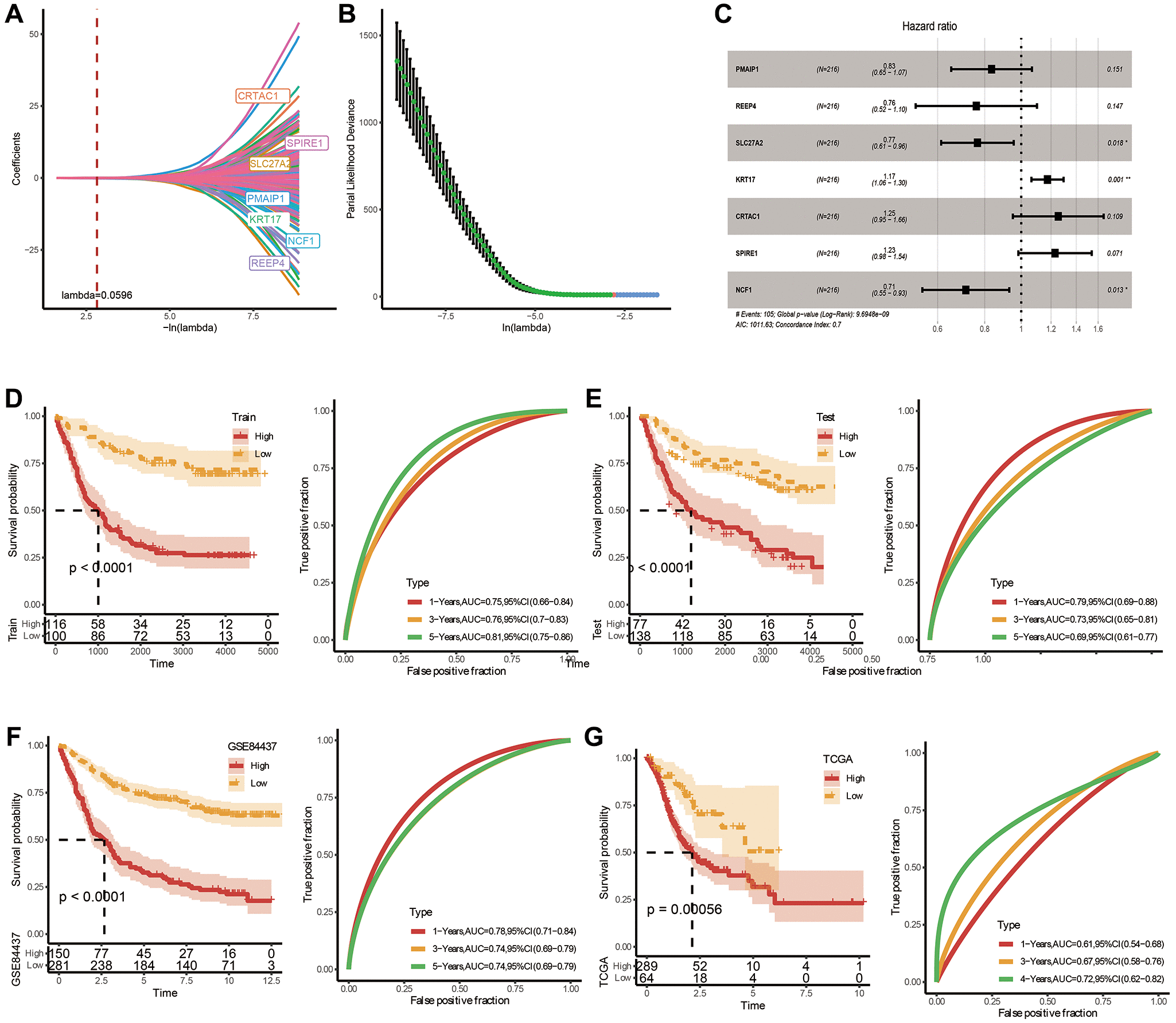 Figure 4. Construction and validation of a prognostic risk signature in TCGA-STAD based on hub FAM-related genes. (A) Lambda trajectory of differentially expressed genes. (B) Confidence interval under lambda. (C) Forest map of FAM-related hub genes. (D) ROC and K-M survival analysis of riskscore in GSE84437-train dataset. (E) ROC and K-M survival analysis of riskscore in GSE84437-test dataset. (F) ROC and K-M survival analysis of riskscore in TCGA dataset. (G) ROC and K-M survival analysis of riskscore in GSE84437 dataset.